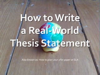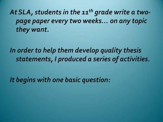 The document outlines strategies for 11th-grade students at SLA to write effective thesis statements for their two-page papers. It emphasizes the importance of developing clear, focused questions that can lead to unique and debatable thesis statements about high schools. Various prompts and methods are provided to help students narrow down their topics and formulate their theses.