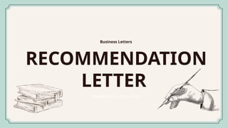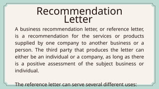 The document outlines the components and purposes of a business recommendation letter, which serves to endorse the quality of a business's services or products. It includes guidance on what to include, such as formal salutations, specific positive experiences, and the writer's contact information. Additionally, a sample letter is presented to illustrate how to effectively recommend an individual based on their qualifications and contributions.