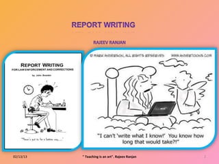 The document discusses various types of reports and their purposes. It provides examples of different report types like periodic operating reports, situational reports, investigative reports, and feasibility reports. It also discusses the differences between reports and correspondence. The document offers guidance on language for describing trends, making projections, recommendations, frequency, probability, and comparison/contrast in reports. It provides examples of formal report language and suggested rephrasing. Finally, it lists sources that were referenced.