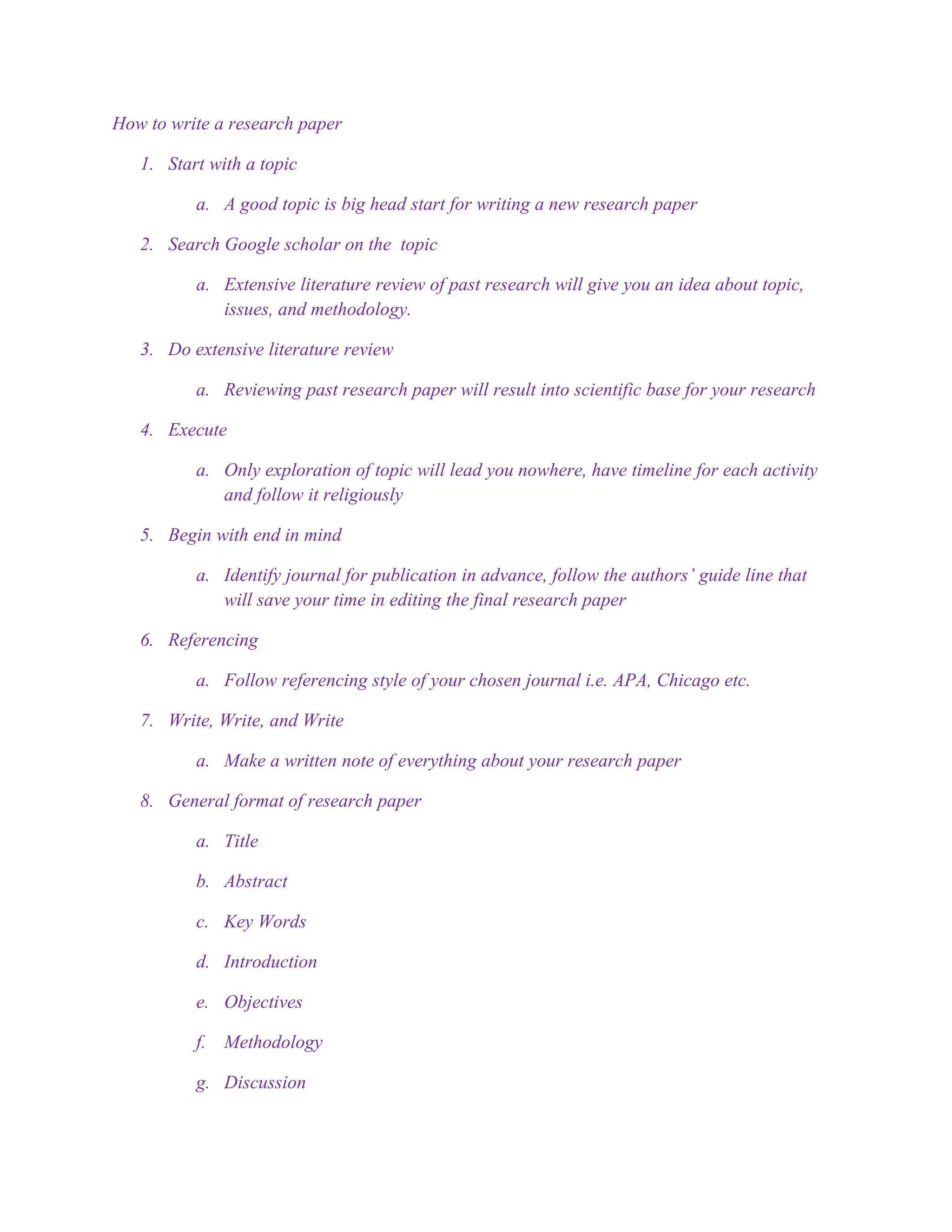 This document outlines the steps to write a research paper, emphasizing the importance of choosing a strong topic and conducting an extensive literature review. It provides a structured format for the paper, including essential sections such as the abstract, methodology, and bibliography. It also highlights the significance of identifying a journal for publication early in the writing process and following the selected journal's referencing style.