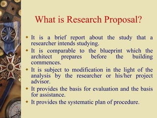 This document provides guidance on writing a research proposal. It begins by defining what a research proposal is and its purpose. It then discusses the key components of a research proposal such as the problem statement, objectives, hypotheses, research methodology, time schedule and expected outcomes. Examples of different types of research proposals and their formats are also provided. Overall, the document serves as a comprehensive guide for developing an effective research proposal.