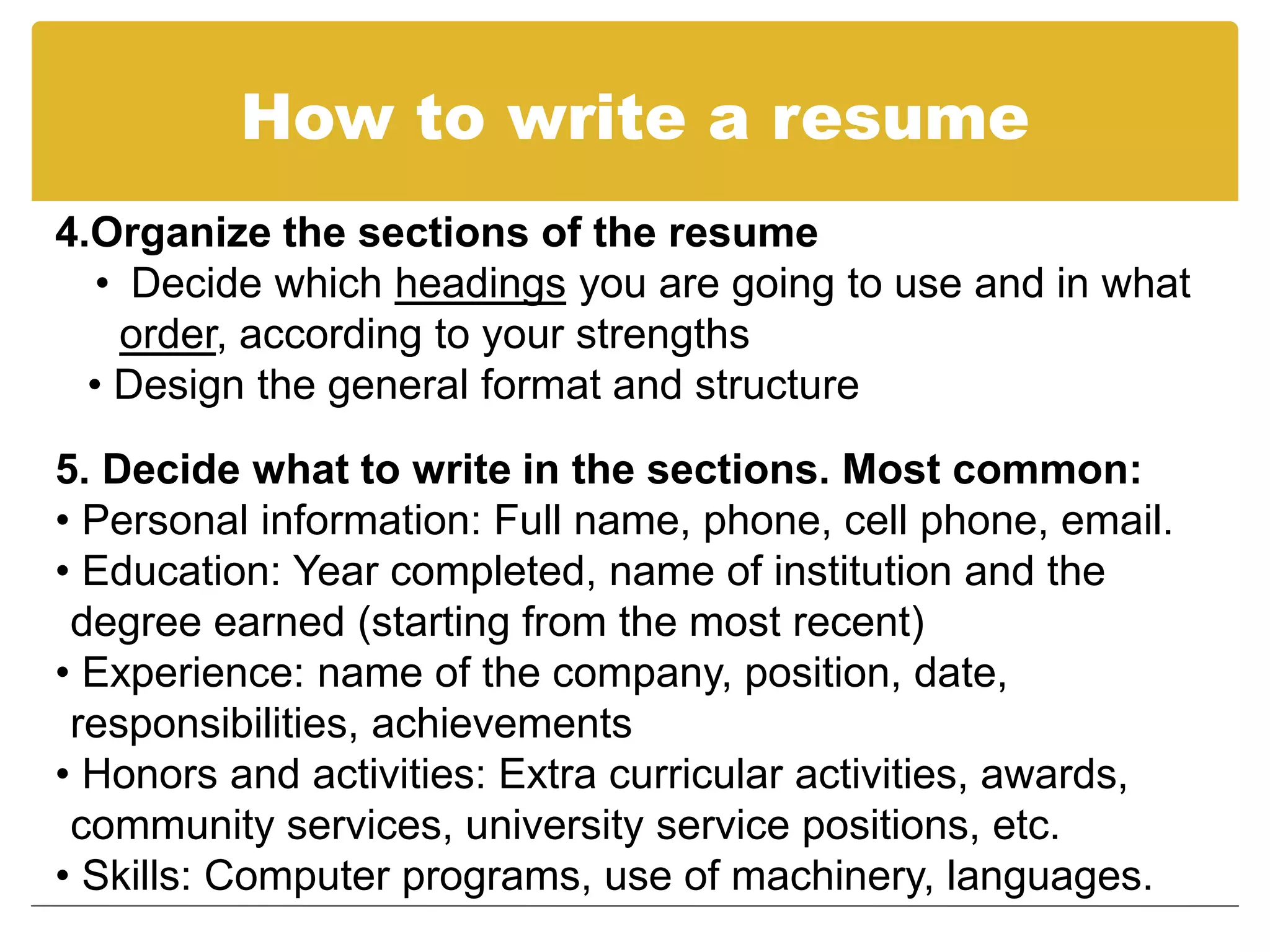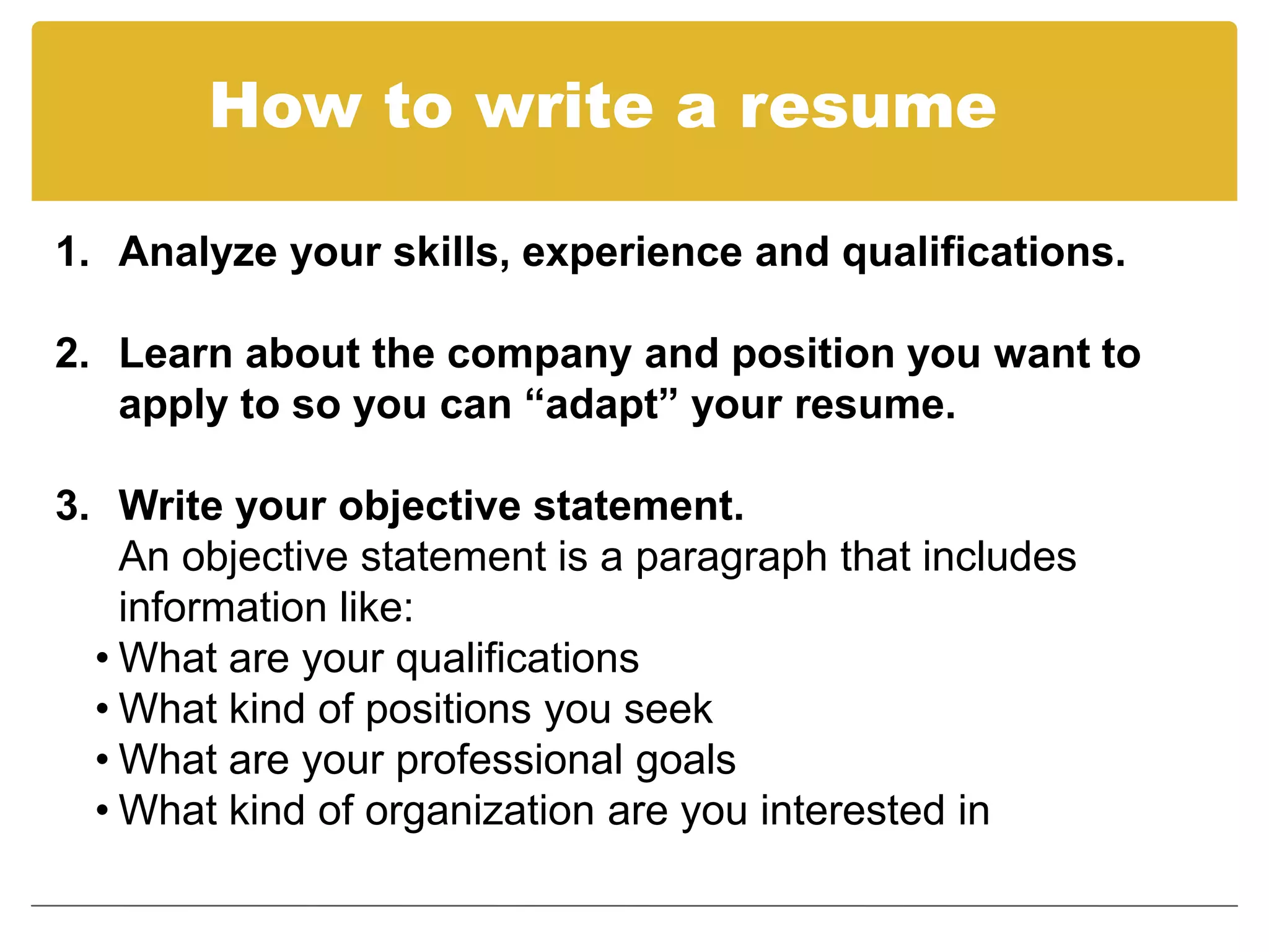 To write a resume, analyze your skills and qualifications, research the company and position, and write an objective statement describing your qualifications, desired positions, goals, and interests. Organize the resume with common sections like personal information, education, experience, honors and activities, and skills. Within each section, decide what specific information to include, such as job responsibilities and achievements in your experience section.