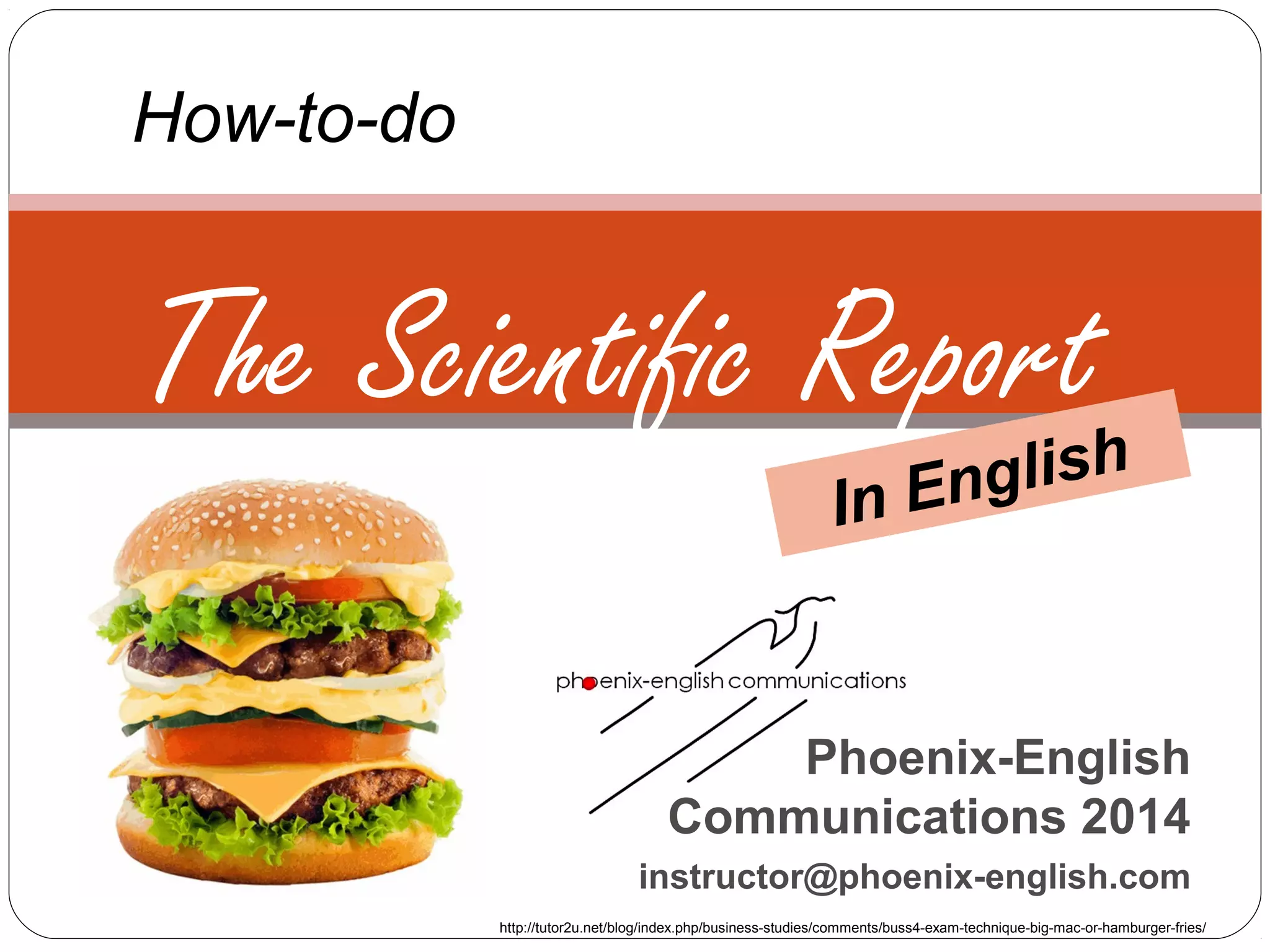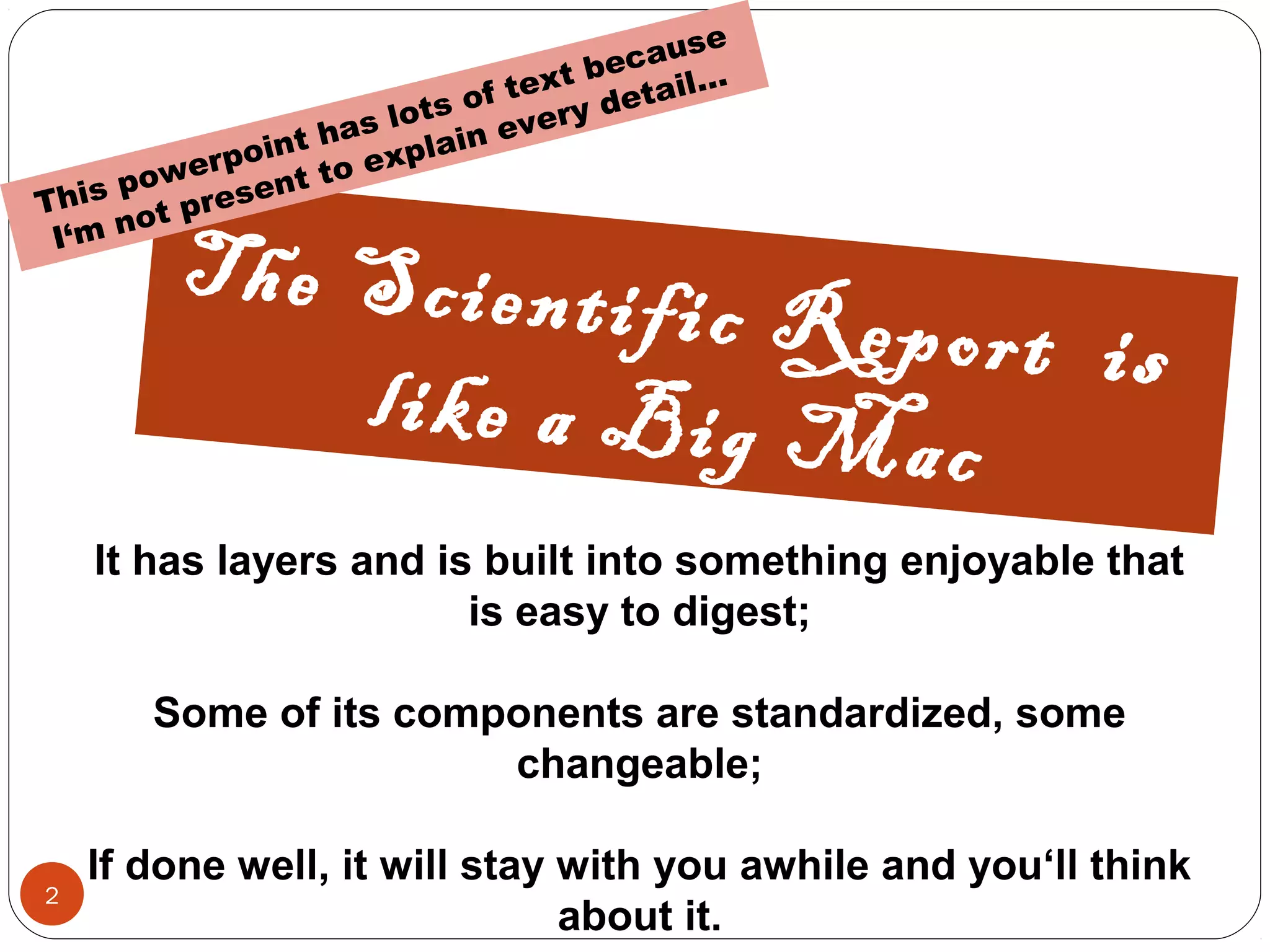 The document provides instructions for writing a scientific report by using the analogy of a Big Mac hamburger. It explains that a scientific report, like a Big Mac, has standardized components that provide structure but also variable elements depending on the specific topic. The main standardized parts of a scientific report outlined are the introduction, methods, results, conclusion, and bibliography. The variable "meat" in the middle provides details on the chosen research topic. Instructions are given for defining a clear problem to structure the research around and for properly citing sources and creating visual elements like figures, charts, and an executive summary to overview the full report.