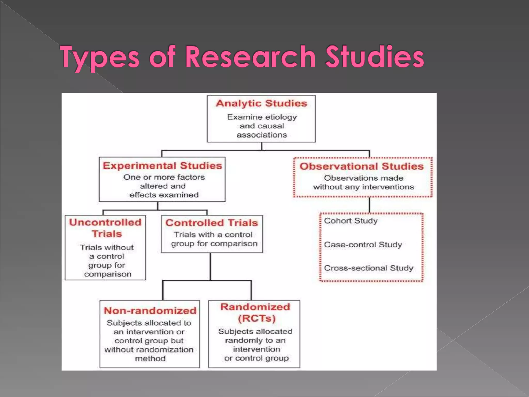 This document discusses different types of research studies and methods. There are two main types of research studies: experimental and observational studies. Experimental studies intentionally introduce a treatment or procedure, while observational studies simply observe behavior without influencing it. Within these two types there are various research methods like randomized controlled trials, cohort studies, and case-control studies. The document also covers key parts of research papers like the introduction, methods, results, and discussion sections. It emphasizes that research is done to systematically increase knowledge and find practical solutions.