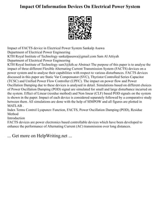This document discusses the impact of Flexible AC Transmission System (FACTS) devices on electrical power systems. It analyzes the capabilities of three FACTS devices - Static Var Compensator (SVC), Thyristor Controlled Series Capacitor (TCSC), and Unified Power Flow Controller (UPFC) - with respect to disturbances on the system. Simulations are conducted to analyze the impact of these devices on power flow and Power Oscillation Damping using different control signal choices. The effect of linear and non-linear control signals is shown. Each device's individual impact is considered, followed by a comparative study between them.