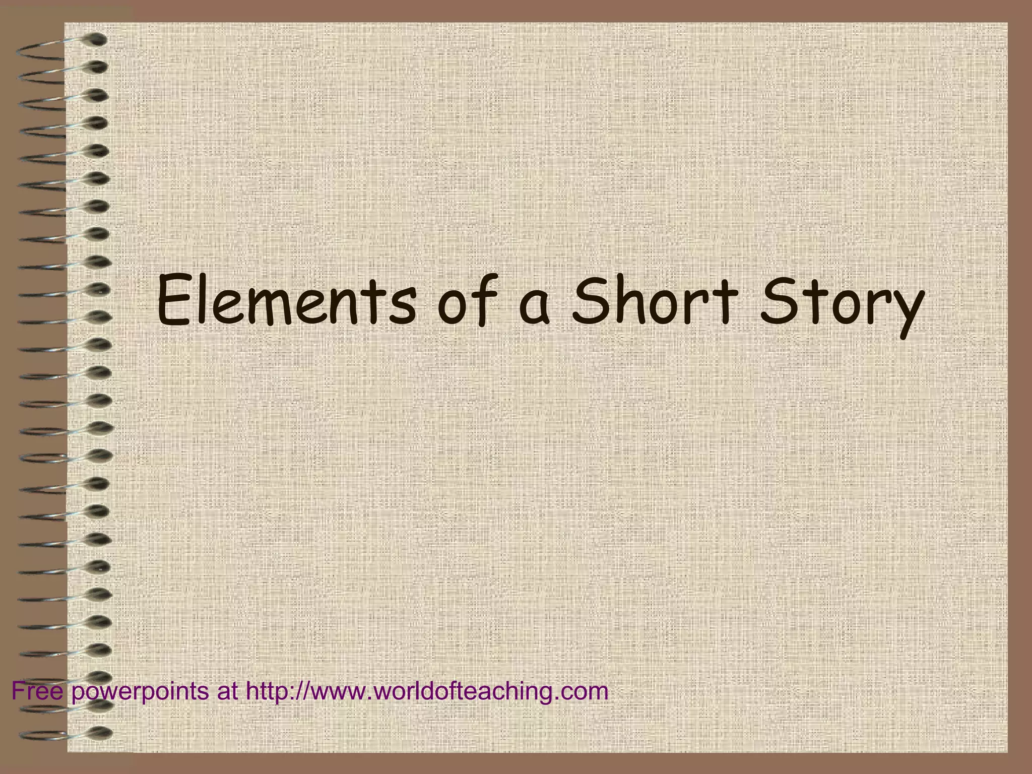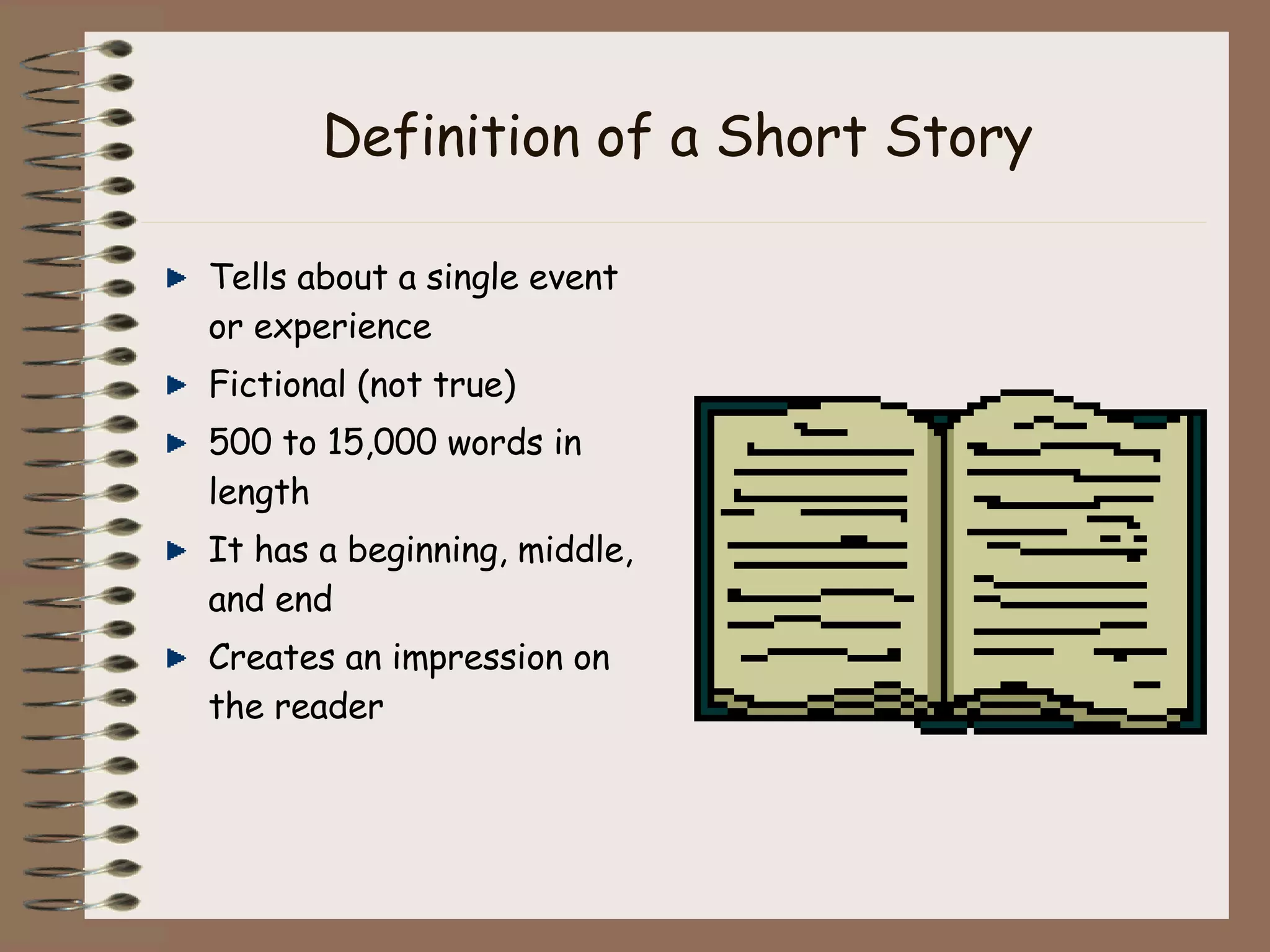 A short story is a fictional piece of writing between 500-15,000 words that tells a single event and has a beginning, middle, and end. It uses elements like setting, characterization, plot, conflict, climax, resolution, theme, and point of view to create an impression on the reader and draw them into the action. The document defines these common elements of a short story and their purposes.