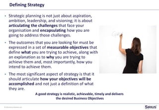 The document discusses strategic planning and defines key terms used in developing an effective strategy. It explains that a good strategy articulates the challenges an organization faces, defines an overall approach to addressing those challenges, and designs coherent actions to implement the approach. An effective strategy identifies measurable objectives and explains how the objectives will be achieved. It also discusses defining business outcomes, objectives, enablers, and delivery vehicles to implement the strategy. The strategy development process involves assessing external opportunities/threats and internal strengths/weaknesses to identify risks and prospects.