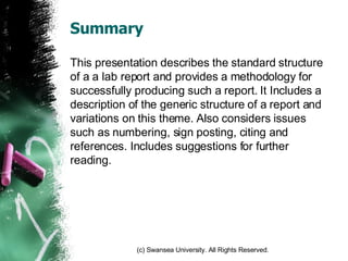This document outlines the standard structure and methodology for writing a technical report, including sections such as summary, introduction, theory, method, results, and conclusions. It emphasizes the importance of proper citation, signposting, and the inclusion of references to enhance the credibility and organization of the report. Additional suggestions for writing techniques and variations based on document type, such as lab reports or dissertations, are also provided.