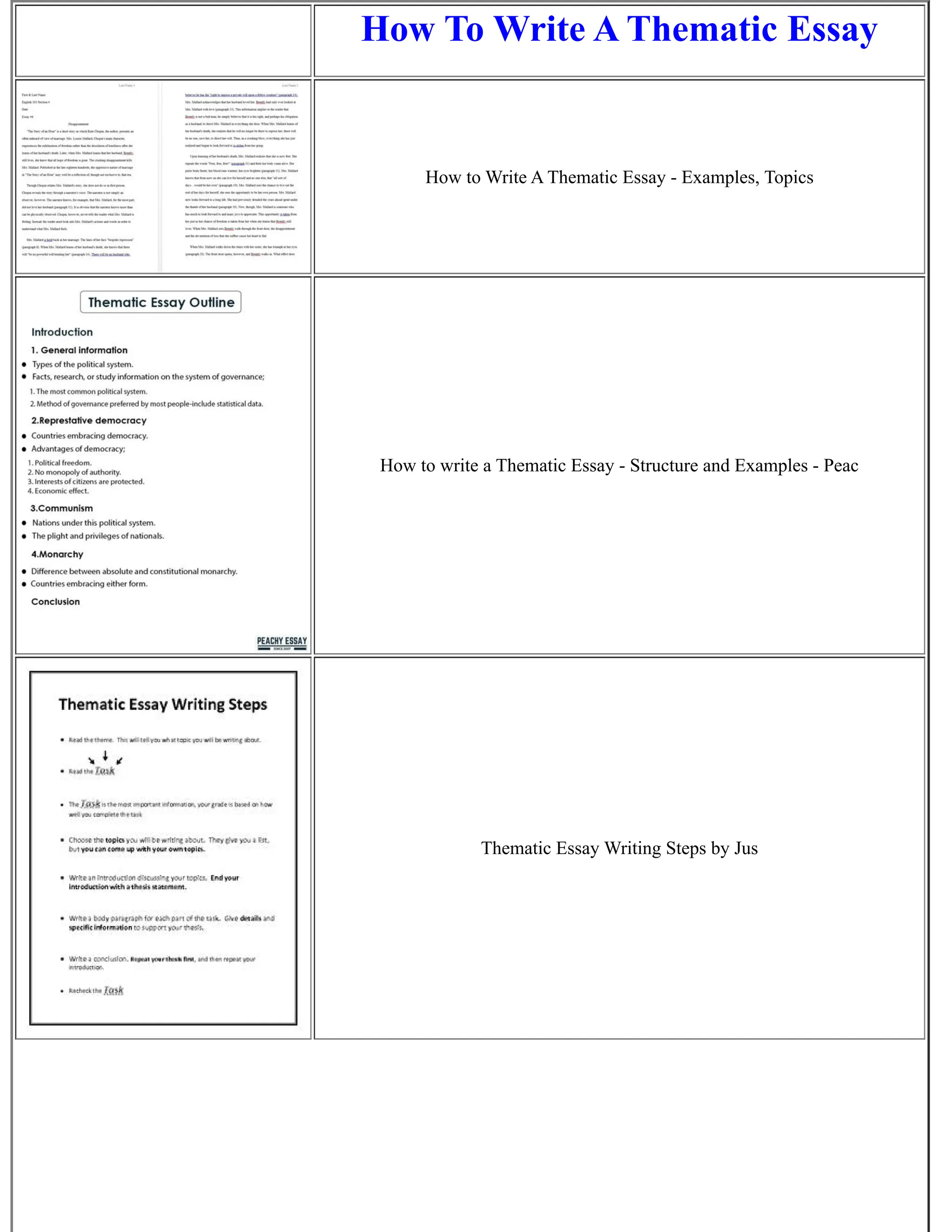 This document provides instructions and examples for writing a thematic essay. It includes outlines, structure, steps for writing, and formatting guidelines. Various sources are referenced that explain how to choose a theme, write a thesis statement, develop paragraphs, and conclude the essay. Examples of thematic essays, photo essays, and literature essays are also mentioned.