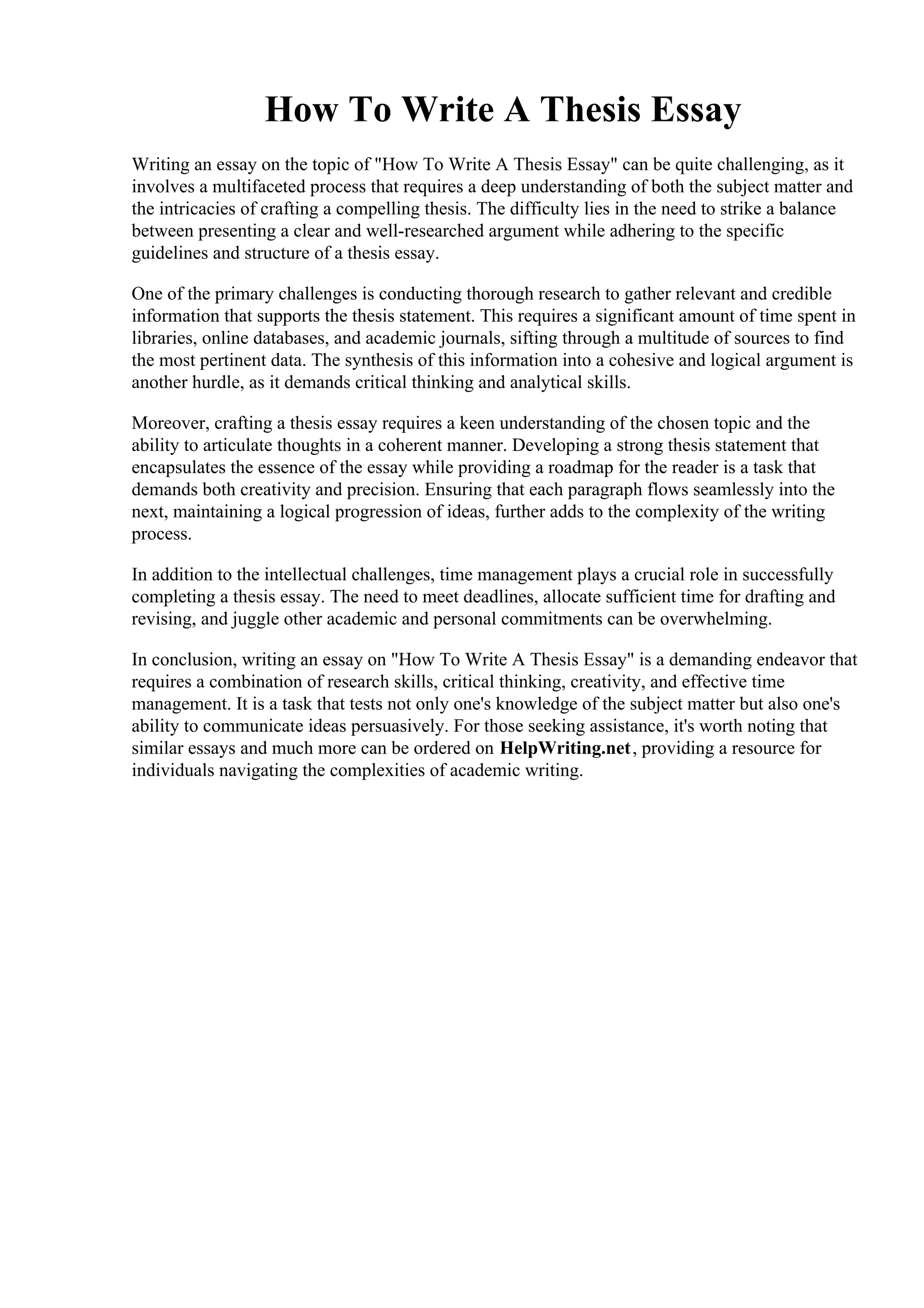 Writing a thesis essay is a complex process that integrates extensive research, critical thinking, and effective communication skills. It involves crafting a compelling thesis statement, organizing ideas cohesively, and managing time to meet deadlines. The challenge of balancing these elements makes the task demanding, yet it is essential for articulating well-supported arguments.
