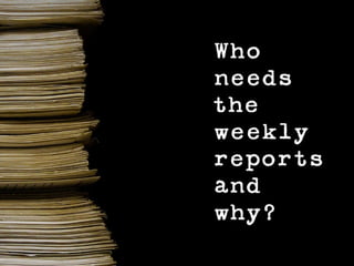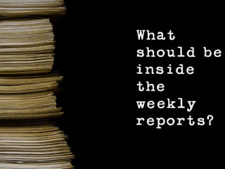 The document provides guidance on writing effective weekly reports. It recommends that weekly reports have a consistent structure with sections like urgent issues, problems, daily work, requests, and plans. The report should be concise at one page and sent in a timely manner. Feedback from management is important and the report helps demonstrate an employee's work and priorities to their manager.