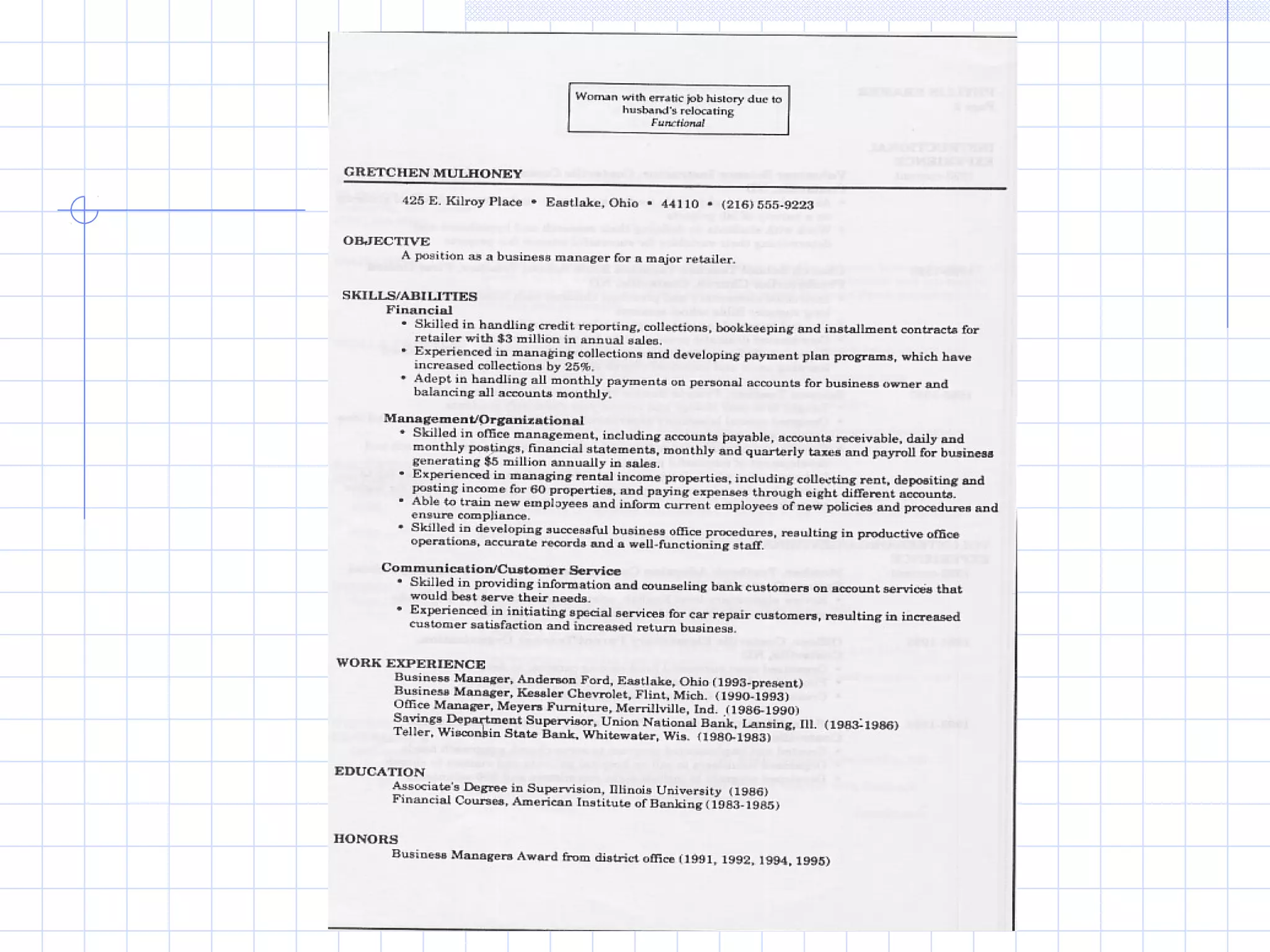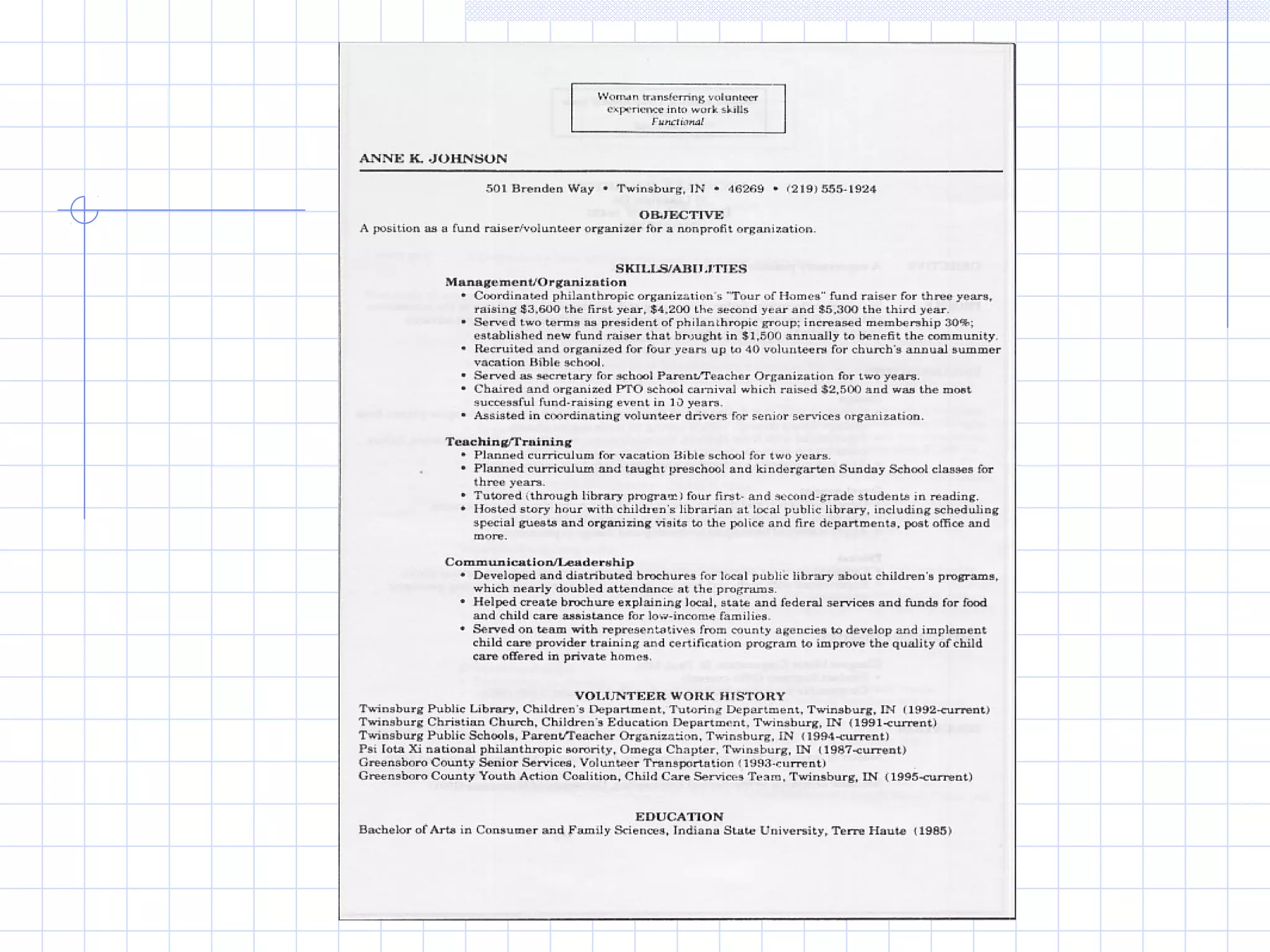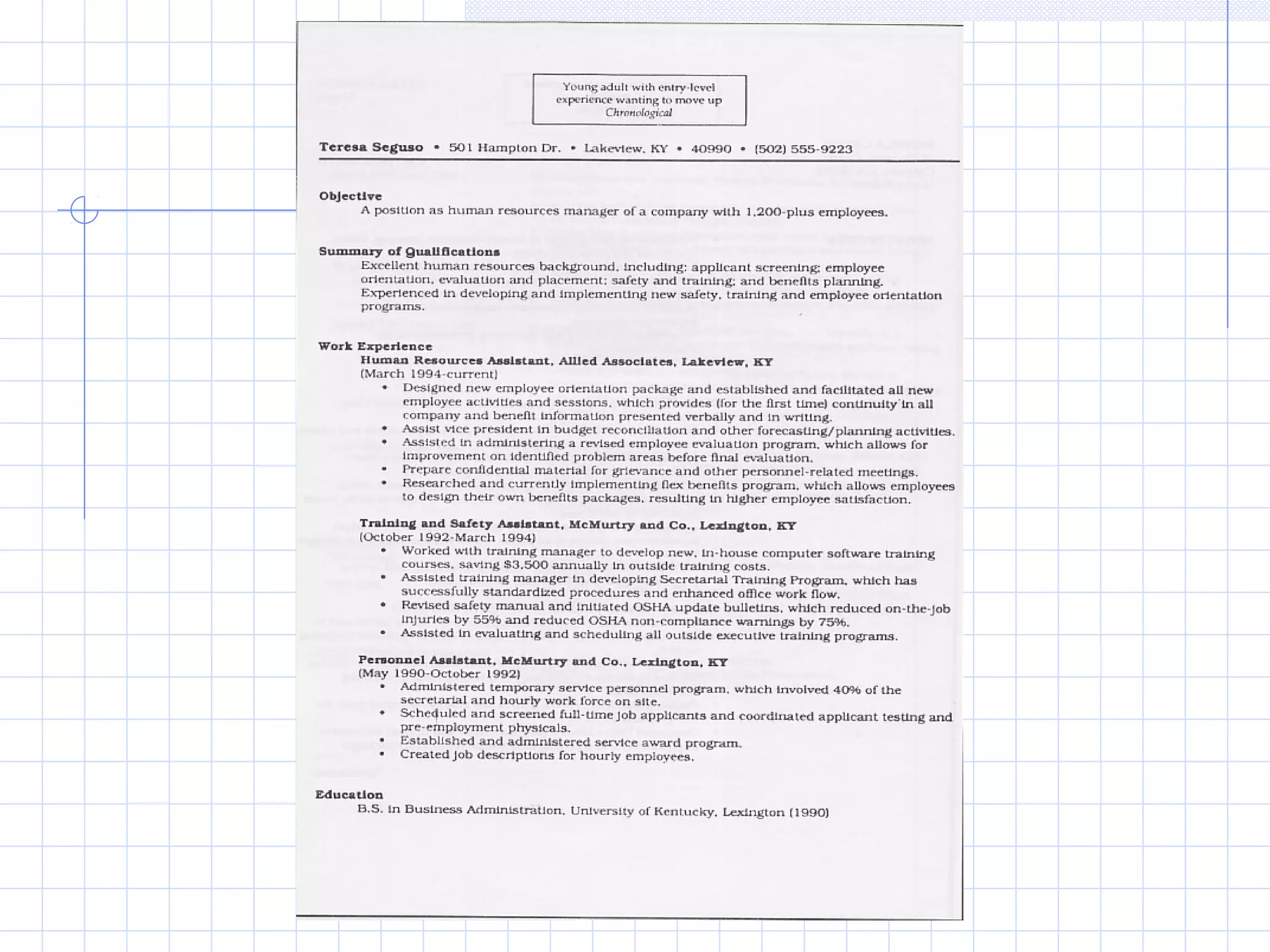 The document provides tips for creating an effective resume, including focusing the top third of the page to grab the employer's attention in 10-20 seconds, and using an objective that highlights how you meet the company's needs. It recommends a functional format that emphasizes skills over chronology, and suggests using action verbs and quantifying accomplishments. Background checks mean only including verifiable responsibilities and achievements on the resume.