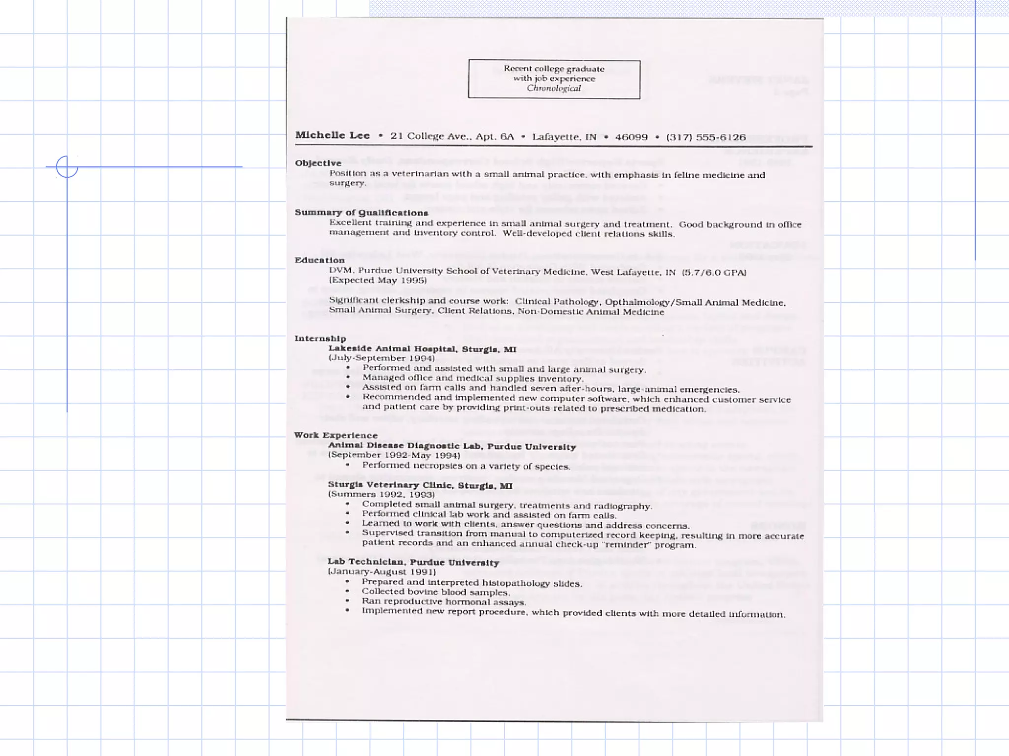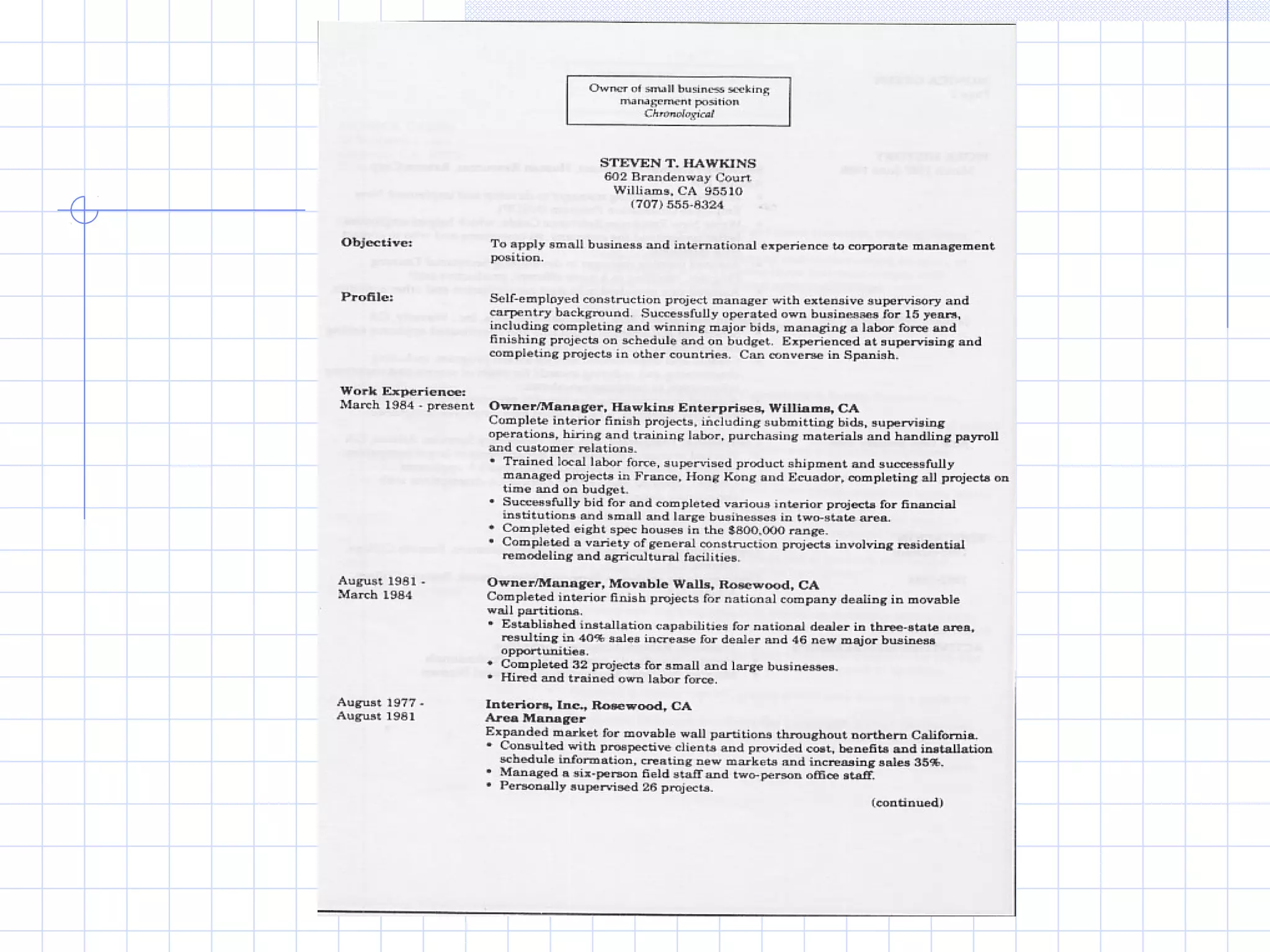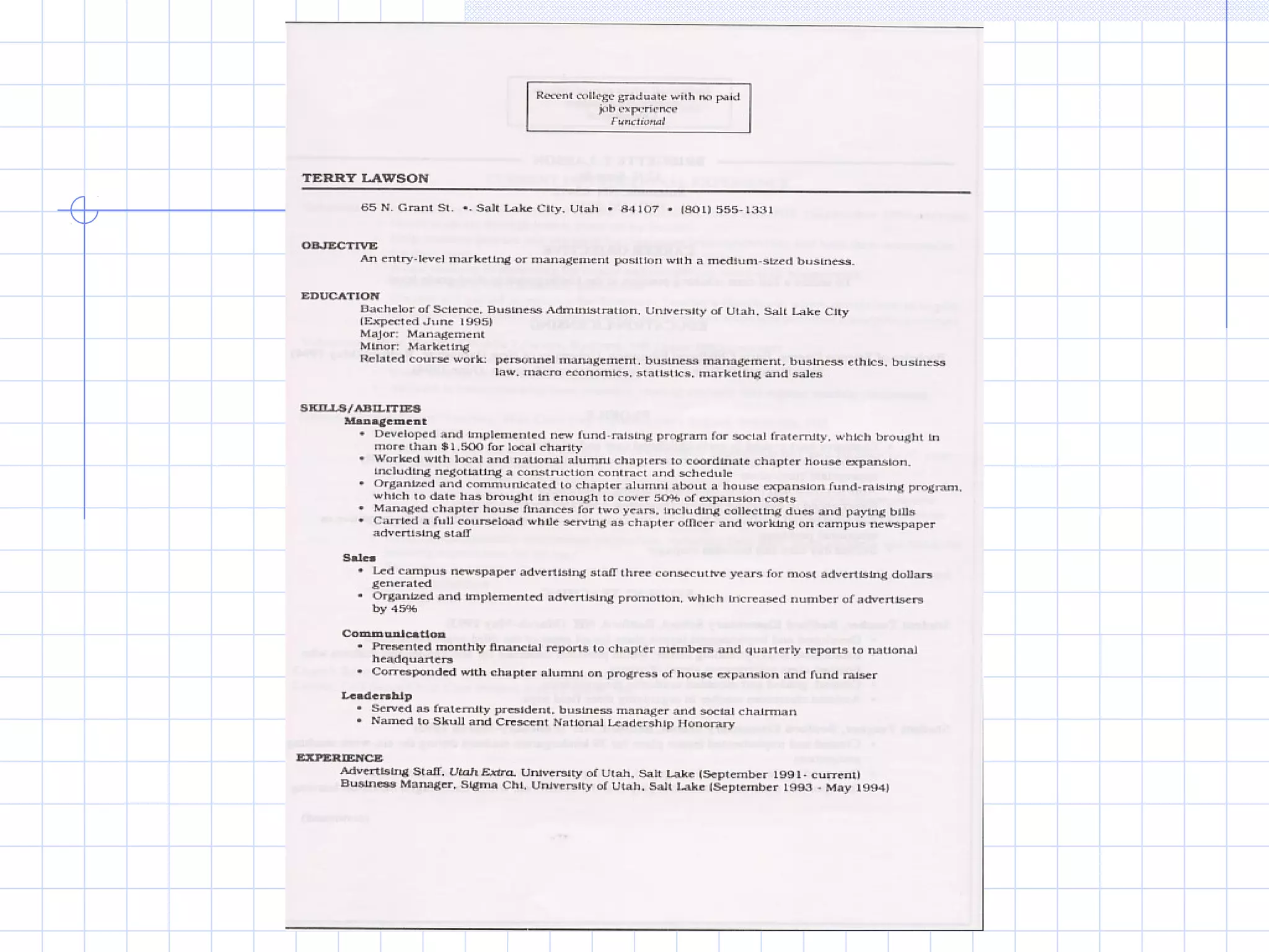 The document provides tips for creating an effective resume, including focusing the top third of the page to grab the employer's attention in 10-20 seconds, and using an objective that highlights how you meet the company's needs. It recommends a functional format that emphasizes skills over chronology, and suggests using action verbs and quantifying accomplishments. Background checks mean only including verifiable responsibilities and achievements on the resume.