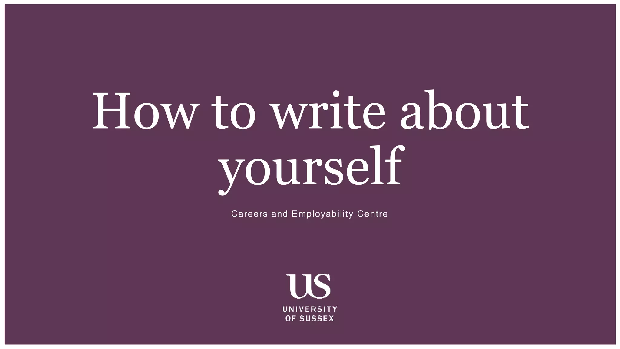 This document provides guidance on writing about yourself for job applications and personal statements. It discusses how self-promotion can be difficult but is an important skill. The document recommends reflecting on your experiences and identifying examples that demonstrate skills like teamwork, communication, and organization. It provides tips for overcoming challenges with self-reflection and promotion, including treating it like an assignment, using positive language and examples from your background, and getting feedback from others.