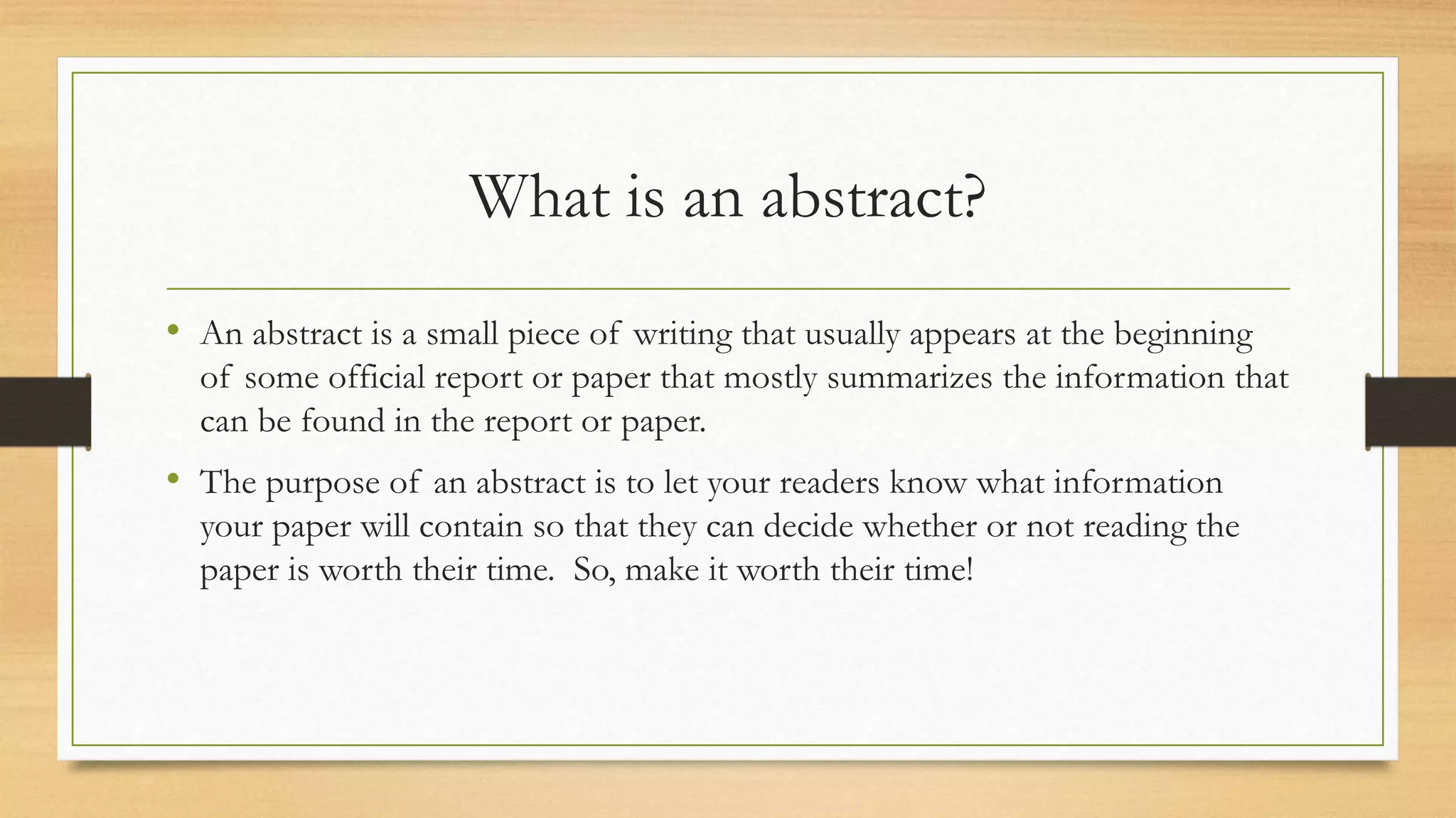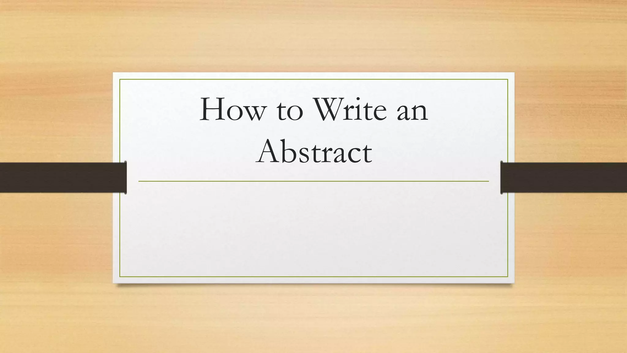 An abstract is a short summary of a longer document that previews the paper's content and purpose. It follows an introduction-body-conclusion structure but in a more condensed form due to its limited length. The introduction states the paper's thesis and research question. The body covers the main ideas in a sentence or two each. The conclusion does not reveal the full findings but gives the gist and leaves reasons to read the full paper. An abstract allows readers to efficiently decide if a paper is relevant without reading the entire document.
