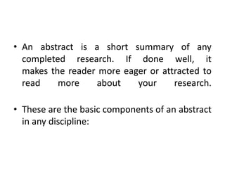 This document provides guidance on how to write an effective abstract. It explains that an abstract is a short summary of completed research that attracts readers to learn more. It lists the basic components an abstract should contain, such as the topic, objectives, methods, findings and conclusions. It also provides tips for writing each component, such as stating the problem and importance upfront and concisely summarizing the key results and implications. Finally, it notes that abstracts allow readers to quickly evaluate a paper's relevance and help researchers locate articles through database searches.