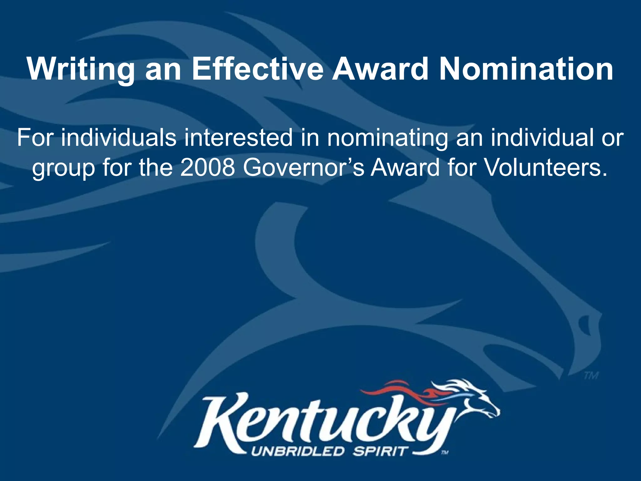 This document provides guidance for writing effective nominations for the 2008 Governor's Award for Volunteers, emphasizing the importance of thoroughness and clarity in describing nominees' contributions. Key tips include reviewing award criteria, providing specific examples, proofreading submissions, and ensuring nominations are likeable and distinct. All nomination packets must be submitted by 4:30 PM on February 18, 2009.