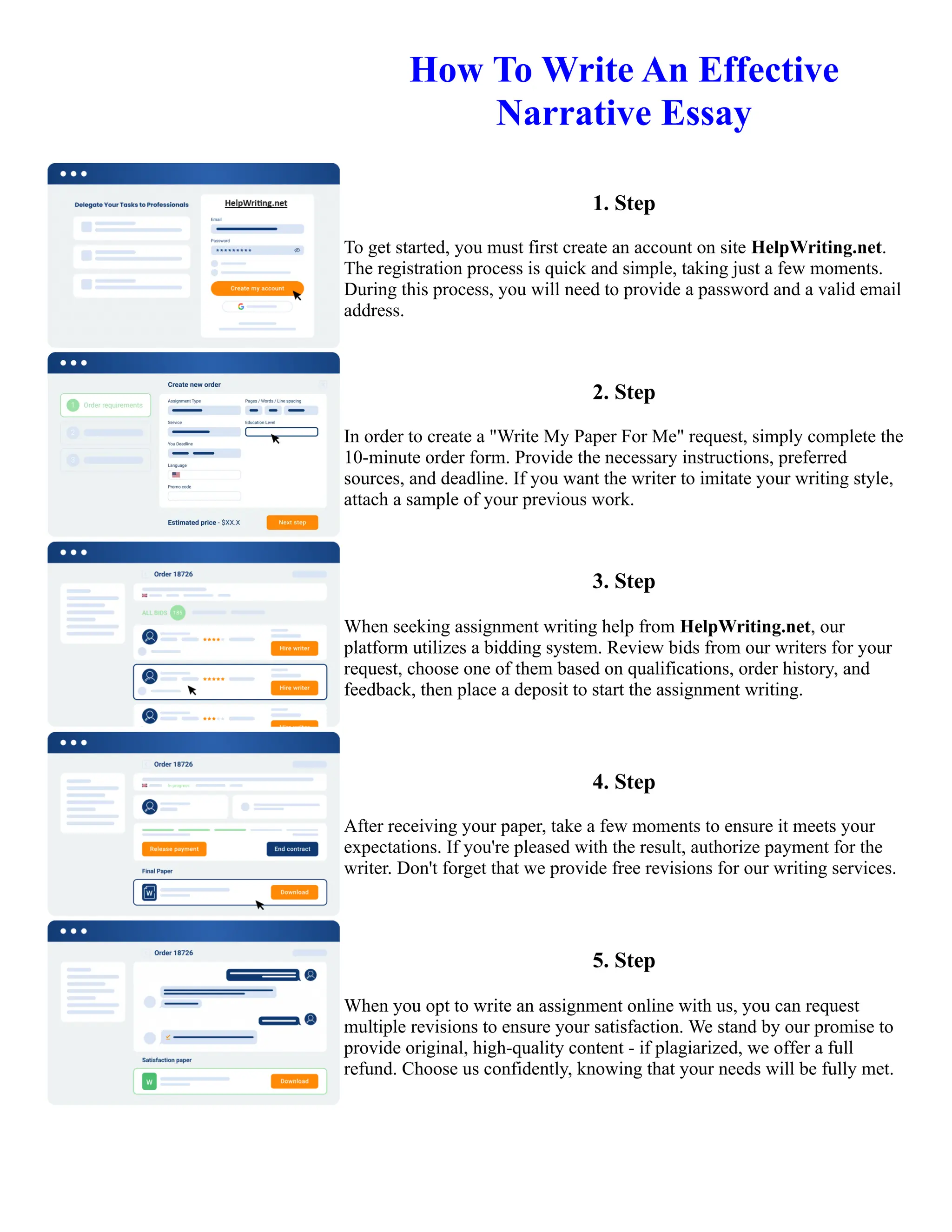The document provides instructions for how to request and complete an assignment writing request on the HelpWriting.net platform. It outlines the 5-step process: 1) Create an account with valid email and password. 2) Complete a 10-minute order form providing instructions, sources, and deadline. 3) Review bids from writers and choose one based on qualifications. 4) Review the completed paper and authorize payment if satisfied. 5) Request revisions until fully satisfied, with the guarantee of a refund for plagiarized work.