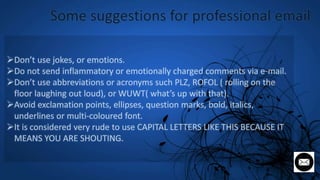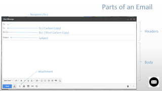 The document expresses gratitude to a teacher for the opportunity to present on email writing, highlighting the importance of effective email communication in personal and professional contexts. It outlines the definition, types, and essential components of emails, as well as tips for writing effective ones. The content emphasizes that despite the prevalence of alternative messaging platforms, email remains vital for formal communication, especially in corporate environments.