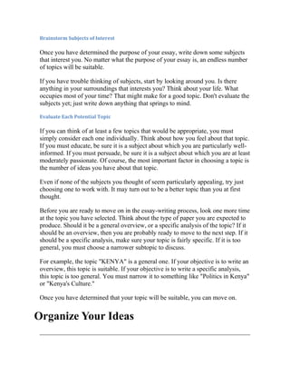 This document provides guidance on choosing a topic for an essay. It discusses both situations where a topic has been assigned or not assigned. For assigned topics, it advises analyzing whether the topic is too general and needs narrowing. For unassigned topics, it recommends defining the essay purpose, brainstorming interests, and evaluating potential topics for suitability. The key steps are determining if the topic fits the essay type, and narrowing general topics to specific subtopics for analysis essays.