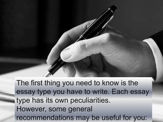 The document provides guidelines on writing various types of essays, including argumentative, compare and contrast, persuasive, synthesis, expository, literary analysis, narrative, rhetorical analysis, and problem-solution essays. It emphasizes understanding the essay type, avoiding common pitfalls, engaging the reader, and using appropriate literature to support arguments. Overall, the instructions aim to help writers improve their essay writing skills and choose the right format for their content.