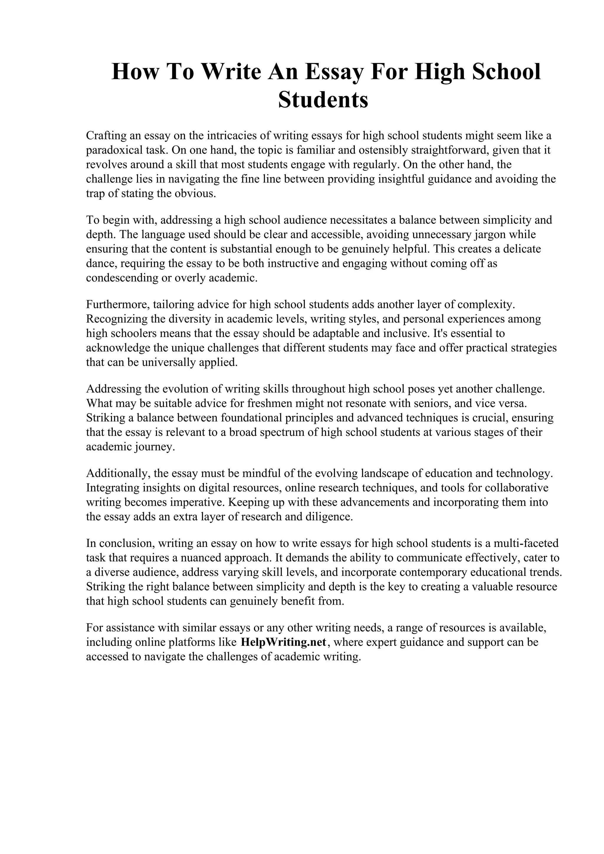 The document discusses the complexities of writing essays for high school students, emphasizing the need to balance clarity and depth while catering to diverse skill levels and integrating contemporary educational trends. It also highlights the challenges of addressing varying advice for different grades, the importance of relevant strategies, and utilizing digital resources. Overall, it underscores the necessity for an effective communication approach to create valuable writing guides for students.