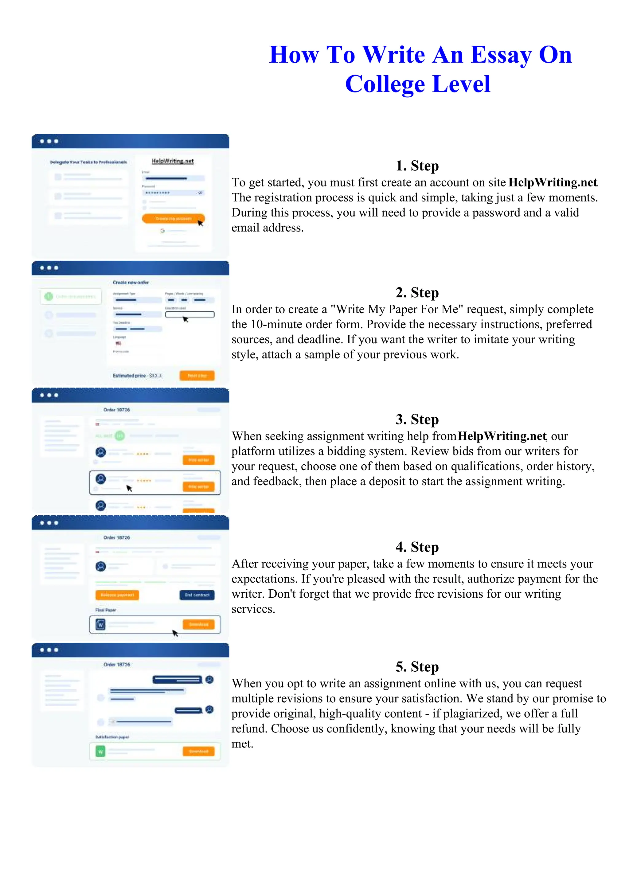This document provides instructions for how to request and complete an assignment writing request through the website HelpWriting.net. It outlines a 5-step process: 1) Create an account with a password and email. 2) Complete a 10-minute order form providing instructions, sources, and deadline. 3) Review bids from writers and choose one based on qualifications. 4) Review the completed paper and authorize payment if pleased. 5) Request revisions to ensure satisfaction, and the website guarantees original, high-quality content or a full refund.