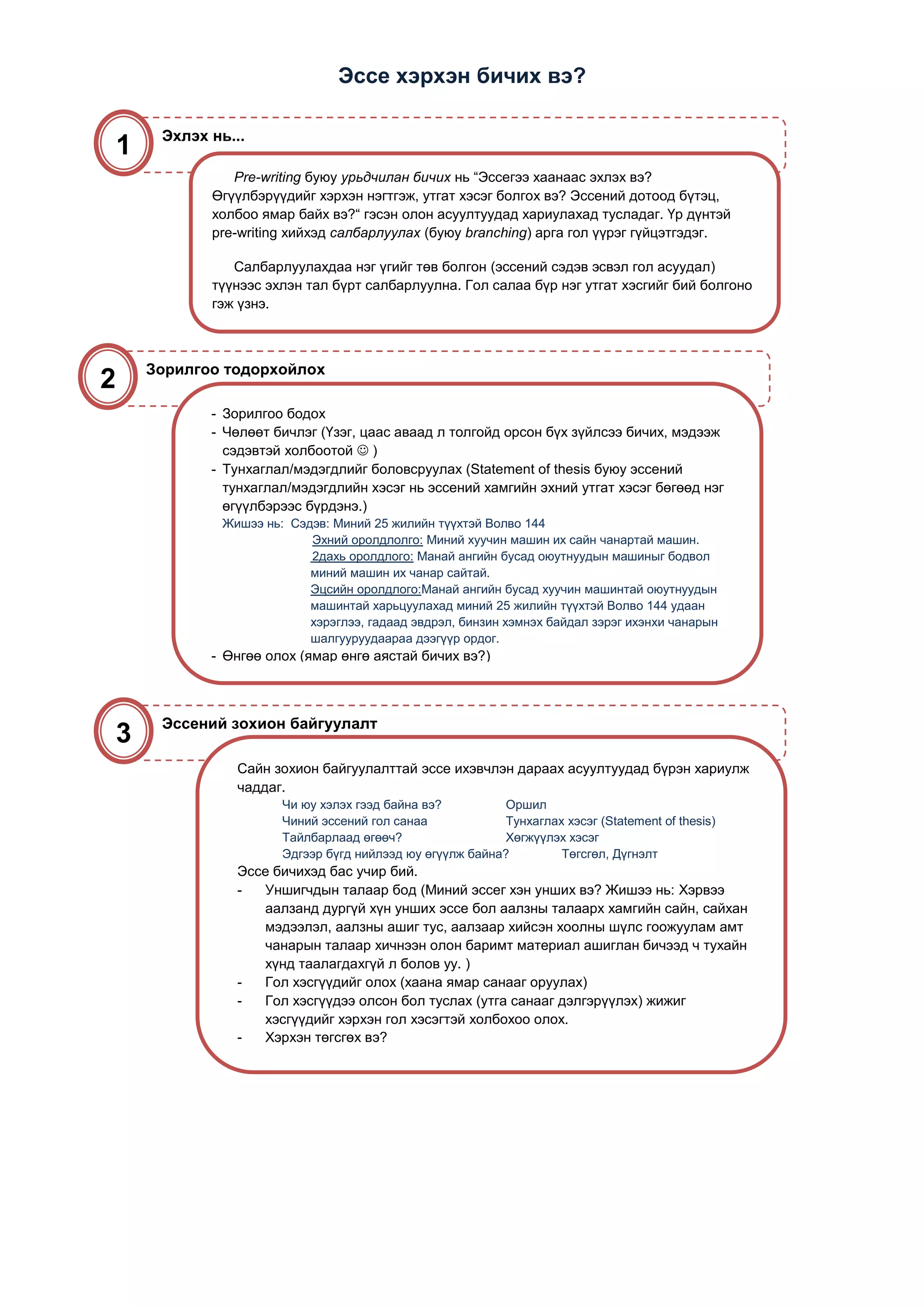 вэ? Эхлэх нь... 1 Pre-writing буюу урьдчилан бичих нь “Эссегээ хаанаас эхлэх вэ? Өгүүлбэрүүдийг хэрхэн нэгтгэж, утгат хэсэг болгох вэ? Эссений дотоод бүтэц, холбоо ямар байх вэ?“ гэсэн олон асуултуудад хариулахад тусладаг. Үр дүнтэй pre-writing хийхэд салбарлуулах (буюу branching) арга гол үүрэг гүйцэтгэдэг. Салбарлуулахдаа нэг үгийг төв болгон (эссений сэдэв эсвэл гол асуудал) түүнээс эхлэн тал бүрт салбарлуулна. Гол салаа бүр нэг утгат хэсгийг бий болгоно гэж үзнэ. Зорилгоо тодорхойлох 2 - Зорилгоо бодох - Чөлөөт бичлэг (Үзэг, цаас аваад л толгойд орсон бүх зүйлсээ бичих, мэдээж сэдэвтэй холбоотой ) - Тунхаглал/мэдэгдлийг боловсруулах (Statement of thesis буюу эссений тунхаглал/мэдэгдлийн хэсэг нь эссений хамгийн эхний утгат хэсэг бөгөөд нэг өгүүлбэрээс бүрдэнэ.) Жишээ нь: Сэдэв: Миний 25 жилийн түүхтэй Волво 144 Эхний оролдлолго: Миний хуучин машин их сайн чанартай машин. 2дахь оролдлого: Манай ангийн бусад оюутнуудын машиныг бодвол миний машин их чанар сайтай. Эцсийн оролдлого:Манай ангийн бусад хуучин машинтай оюутнуудын машинтай харьцуулахад миний 25 жилийн түүхтэй Волво 144 удаан хэрэглээ, гадаад эвдрэл, бинзин хэмнэх байдал зэрэг ихэнхи чанарын шалгууруудаараа дээгүүр ордог. - Өнгөө олох (ямар өнгө аястай бичих вэ?) Эссений зохион байгуулалт 3 Сайн зохион байгуулалттай эссе ихэвчлэн дараах асуултуудад бүрэн хариулж чаддаг. Чи юу хэлэх гээд байна вэ? Оршил Чиний эссений гол санаа Тунхаглах хэсэг (Statement of thesis) Тайлбарлаад өгөөч? Хөгжүүлэх хэсэг Эдгээр бүгд нийлээд юу өгүүлж байна? Төгсгөл, Дүгнэлт Эссе бичихэд бас учир бий. - Уншигчдын талаар бод (Миний эссег хэн унших вэ? Жишээ нь: Хэрвээ аалзанд дургүй хүн унших эссе бол аалзны талаарх хамгийн сайн, сайхан мэдээлэл, аалзны ашиг тус, аалзаар хийсэн хоолны шүлс гоожуулам амт чанарын талаар хичнээн олон баримт материал ашиглан бичээд ч тухайн хүнд таалагдахгүй л болов уу. ) - Гол хэсгүүдийг олох (хаана ямар санааг оруулах) - Гол хэсгүүдээ олсон бол туслах (утга санааг дэлгэрүүлэх) жижиг хэсгүүдийг хэрхэн гол хэсэгтэй холбохоо олох. - Хэрхэн төгсгөх вэ?