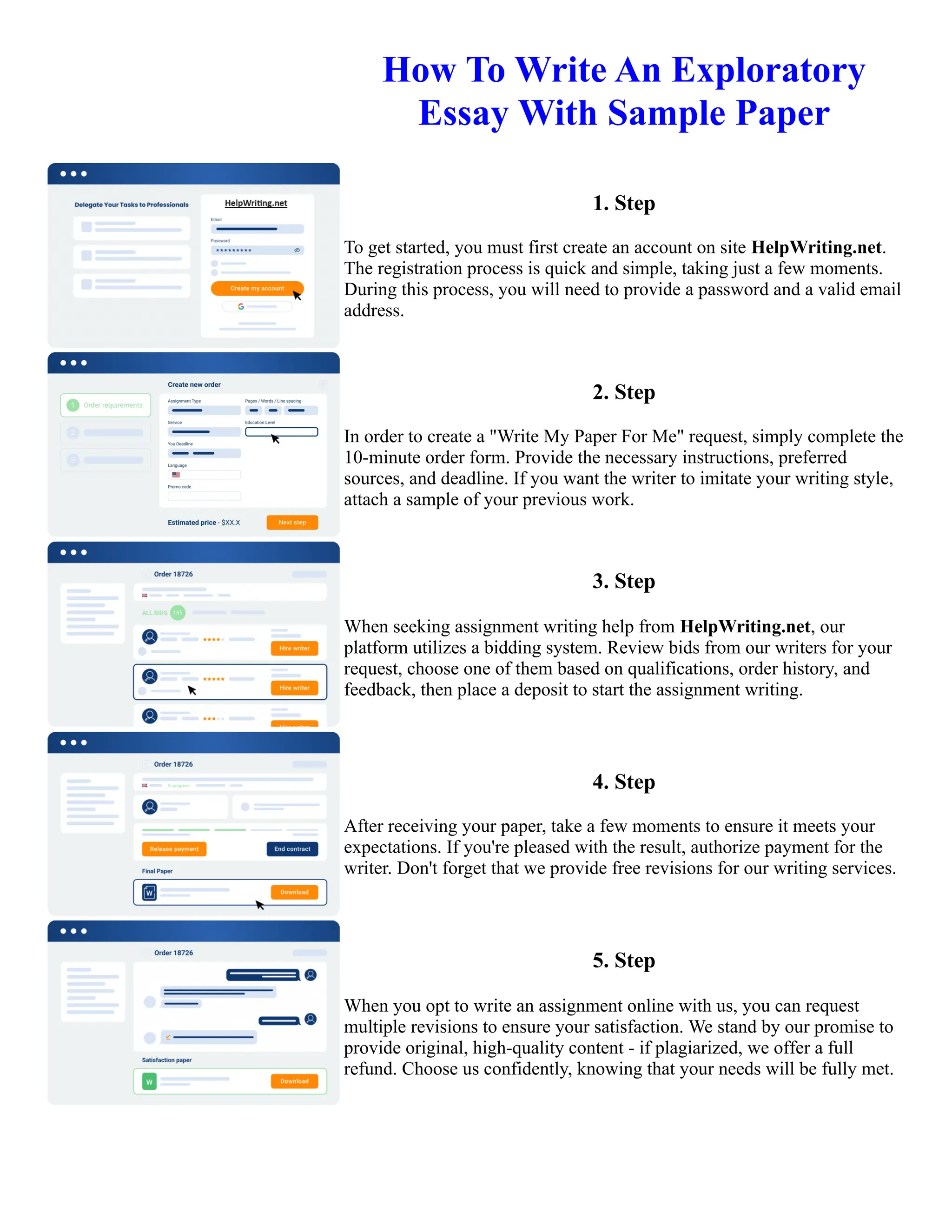 The document provides steps for requesting assignment writing help from HelpWriting.net. It explains that users must first create an account, then complete an order form providing instructions and deadline. Writers will bid on the request, and the user can choose a writer based on qualifications. The writer will complete the assignment, which the user can request revisions for until satisfied. HelpWriting.net promises original, high-quality work or a full refund.