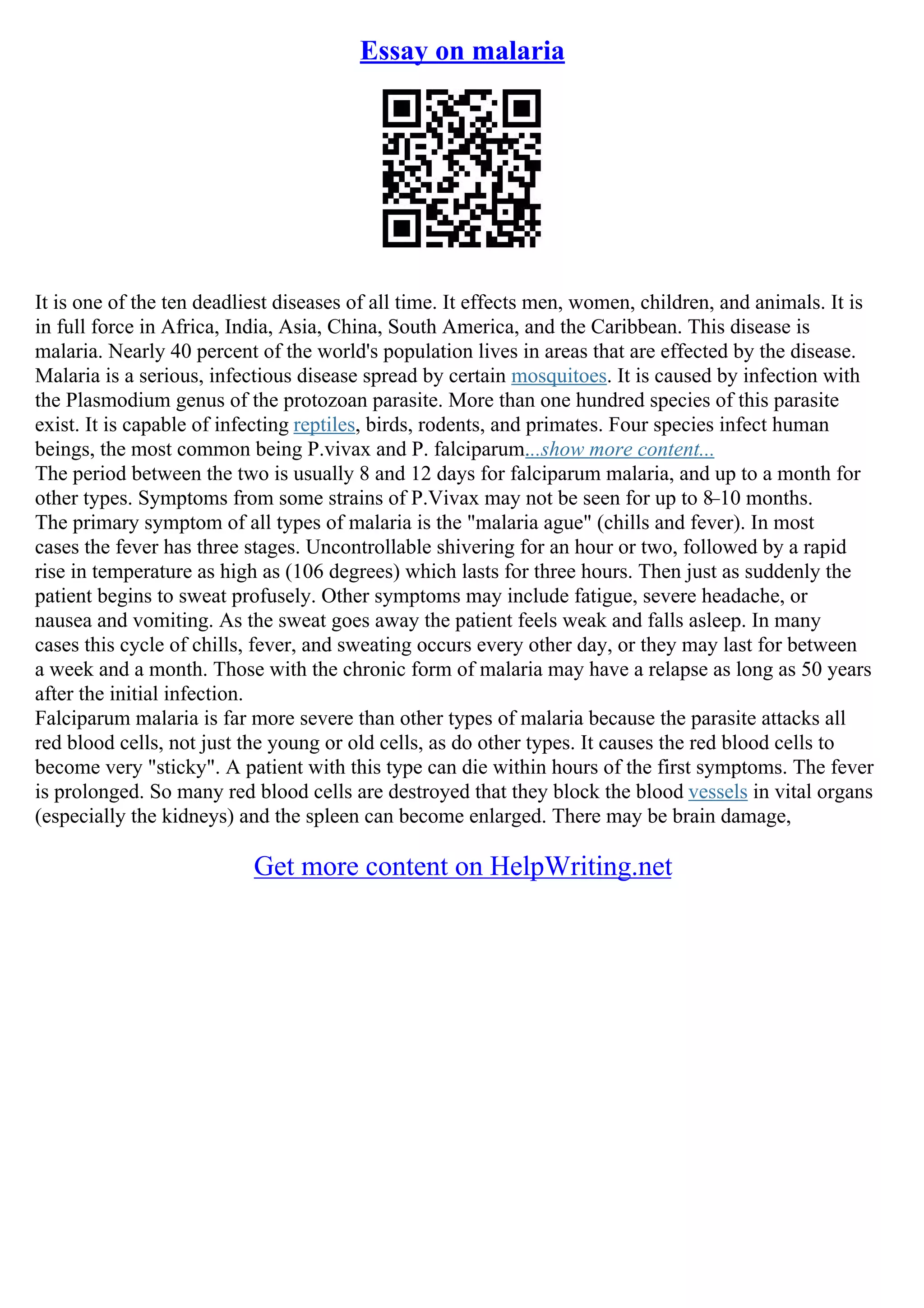 The document discusses malaria as one of the deadliest diseases, affecting a significant portion of the global population, primarily transmitted by mosquitoes and caused by the Plasmodium parasite. It outlines the symptoms, particularly the severe nature of falciparum malaria, and emphasizes the importance of understanding the disease's impact. Additionally, it touches on various essays about education and personal development, highlighting the need for effective learning environments and the consequences of poor hygiene.