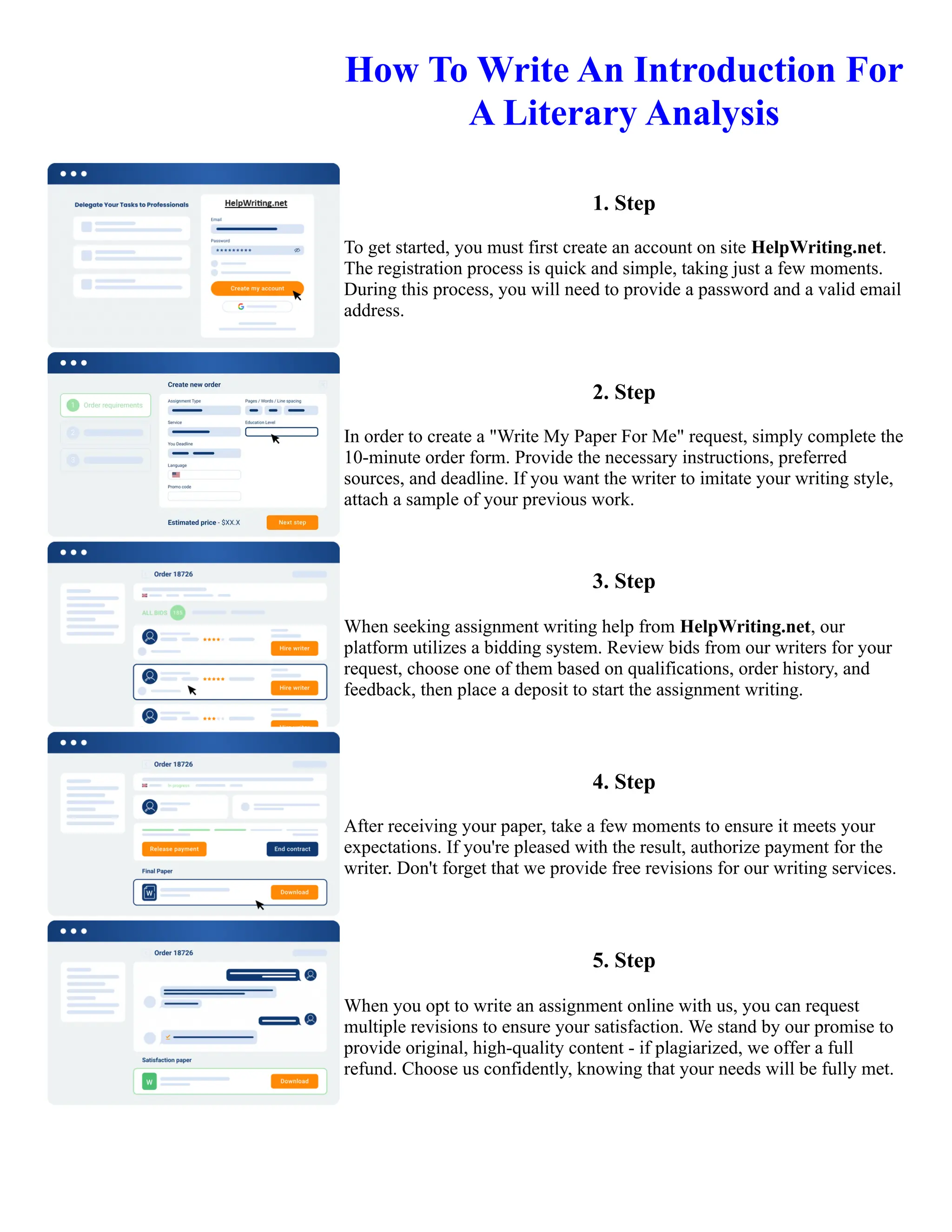 This document provides instructions for how to request and receive help with writing assignments from the website HelpWriting.net. It outlines a 5-step process: 1) Create an account with a password and email. 2) Complete an order form with instructions, sources, and deadline. 3) Review bids from writers and choose one. 4) Receive the paper and authorize payment if satisfied. 5) Request revisions until needs are fully met. The process aims to match clients with qualified writers to receive original, high-quality content.