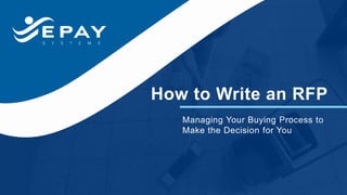The document outlines an RFP (Request for Proposal) process, emphasizing the importance of thorough project planning and evaluation methods for selecting vendors in a business context. It includes guidelines on drafting an effective RFP, sharing it with vendors, handling Q&A processes, and reviewing proposals to make an informed final decision. Additionally, it highlights common mistakes to avoid for ensuring a smooth procurement experience.
