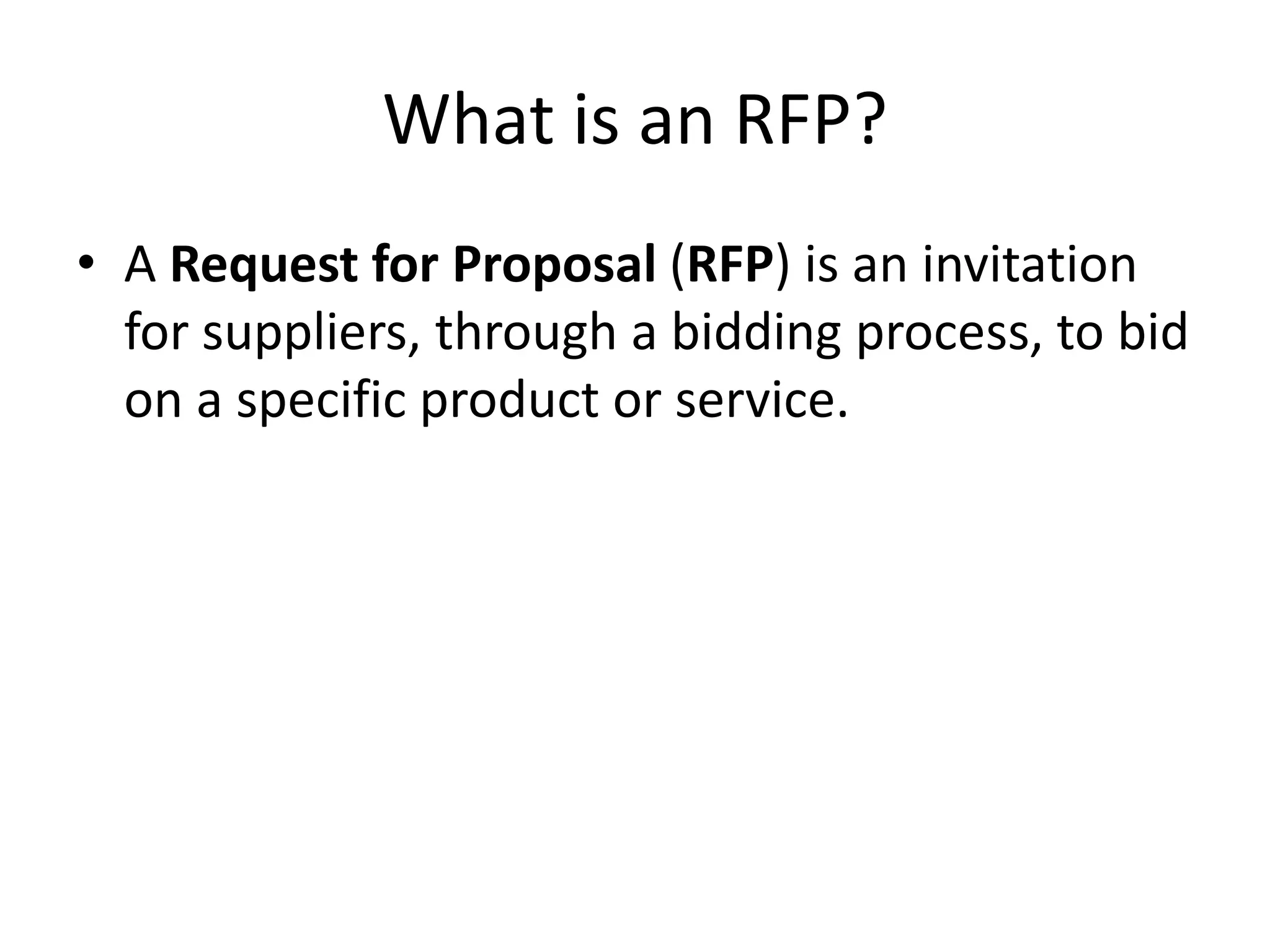 An RFP is a request for proposal sent to suppliers to bid on a specific product or service. The document outlines the RFP process and what information should be included in an RFP. It provides details on creating an RFP, including establishing selection criteria and a timeline. It also describes what information should be provided to vendors, such as the project background and requirements, and what should be requested from vendors in their proposals, like their solution, budget, and references. Finally, it gives an example RFP assignment for planning a fundraising dinner.