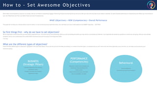 The document provides guidance on how to write SMART objectives. It explains that objectives should be specific, measurable, attainable, relevant, and time-bound. An example objective is given to improve communication consistency, with details filled into a table matching each letter of SMART. Objectives help employees know what is expected of them and guide their performance and contributions.