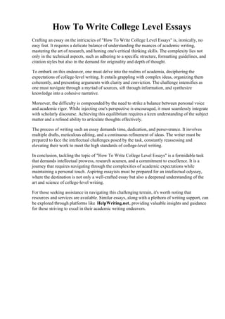 The document discusses various aspects of crafting college-level essays, emphasizing the balance between academic rigor and personal voice while navigating complex ideas and research. It also highlights the challenges of maintaining originality and clarity in writing and suggests that success in this endeavor requires time and dedication. Other sections of the document cover topics such as nuclear power safety, political decentralization, the qualities of true friendship, software's role in societal progress, and the history of the Ku Klux Klan.