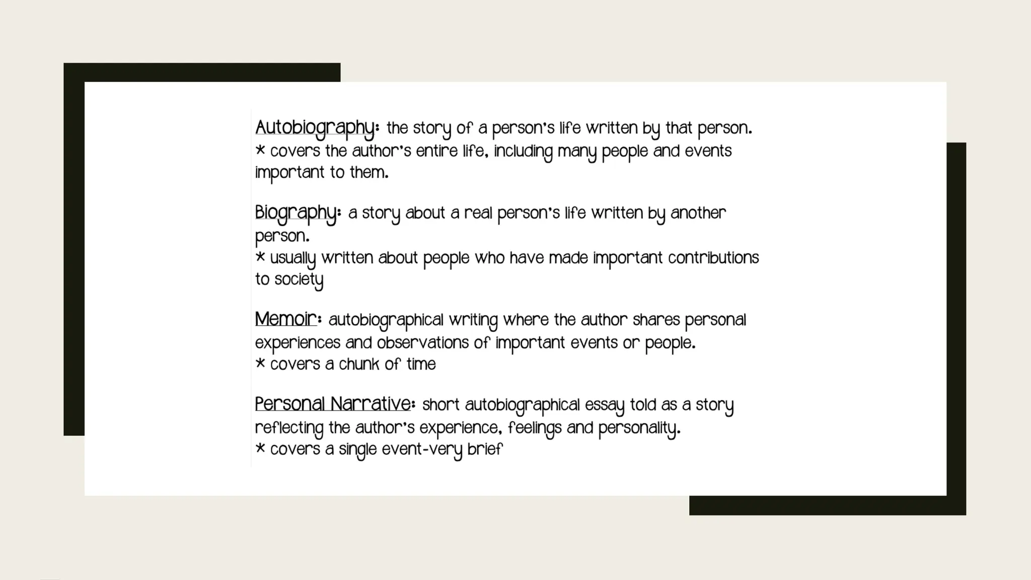 The document is a guide for an 8-week creative writing workshop focused on memoir writing, emphasizing the exploration of personal experiences through various narrative techniques. It lays out definitions of creative writing, differentiates between technical and creative forms, and outlines the memoir's structure, including thematic elements, emotional arcs, and the importance of authenticity. Participants are encouraged to reflect on significant life events and to utilize their unique perspectives to craft compelling personal essays.