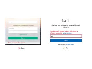 This document provides best practices for writing error messages. It recommends that error messages be specific about what happened, constructive by indicating how to fix the issue, understandable by avoiding technical jargon, positively tone by not blaming the user, use plain English, be consistent in terminology, avoid using red colors, and can include humor to reduce frustration. The document also provides examples of good and bad error messages and recommends using active voice, present tense, and descriptors to clarify meaning. The overall goal is to write error messages that clearly explain the problem and solution without irritating the user.