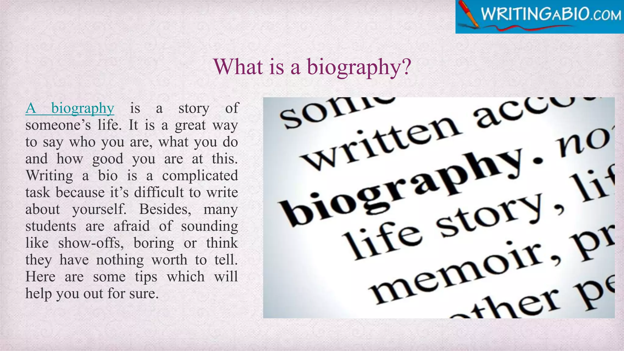 The document provides guidance on writing a professional student biography, emphasizing the importance of clarity, relevance, and personal storytelling. Key components include personal details, educational background, accomplishments, and interests, while also advising against unnecessary personal information and cliché language. It suggests using active voice, humor to engage readers, and the necessity of proofreading for a polished final product.