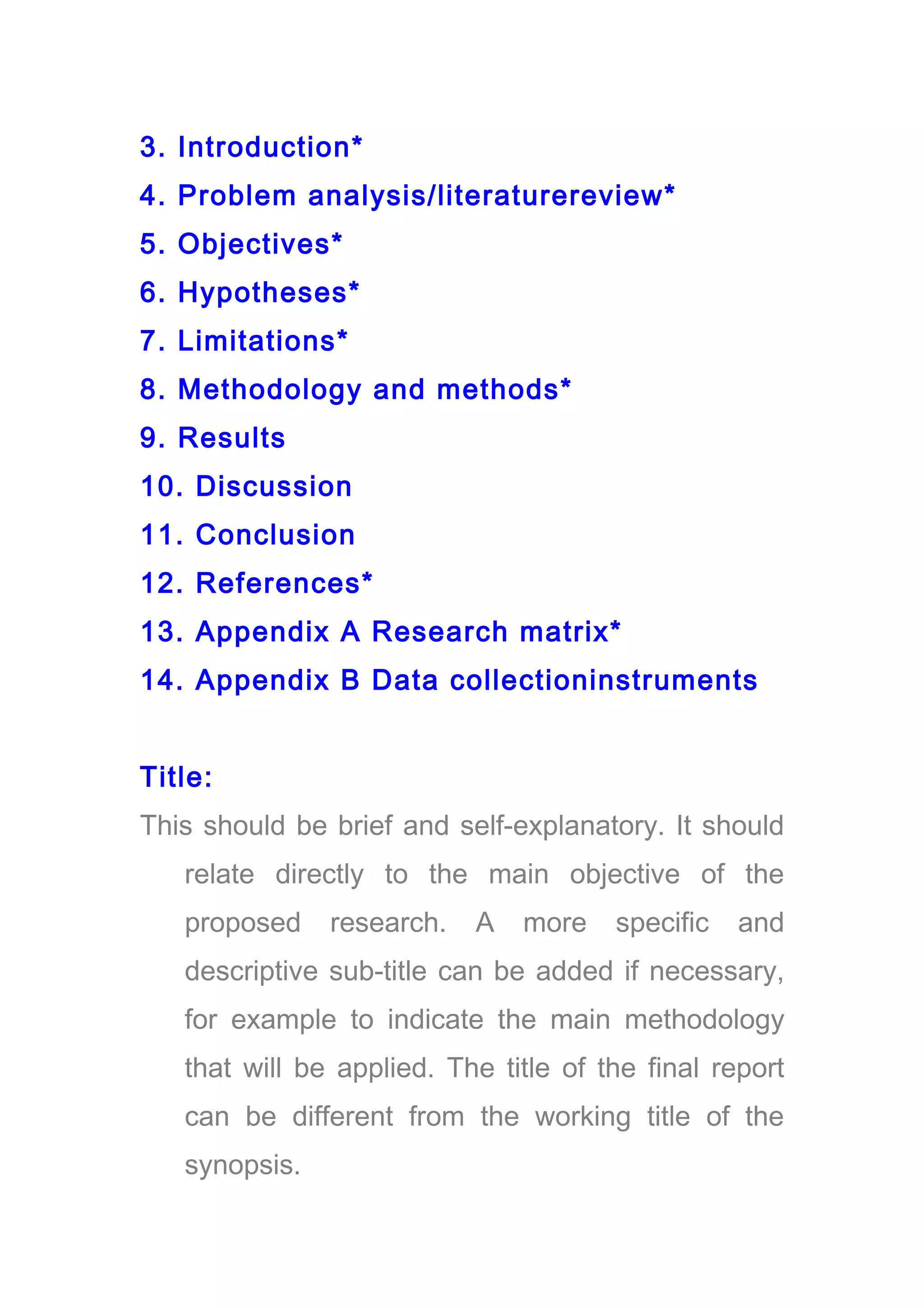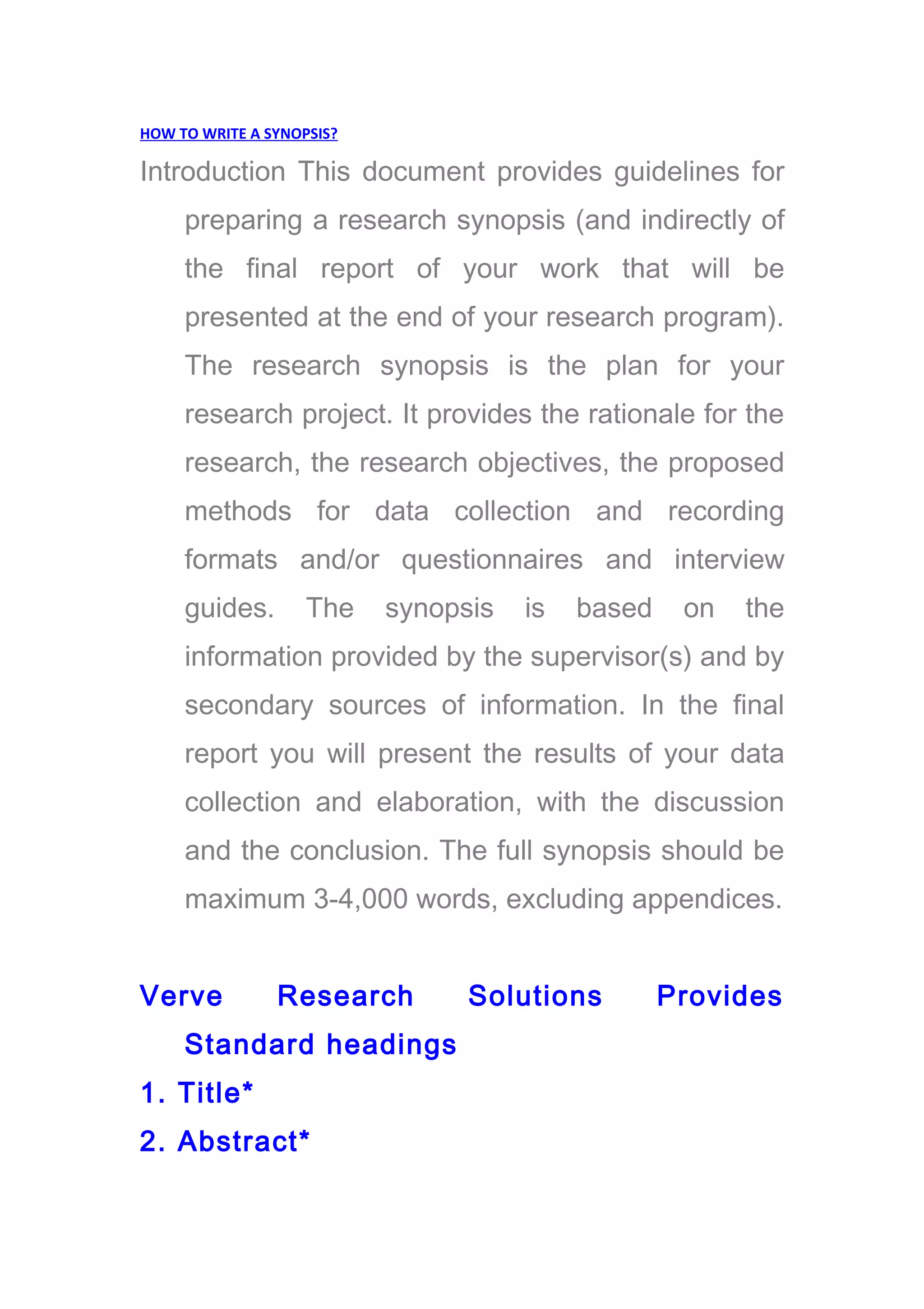 This document provides guidelines for creating a research synopsis, outlining key components such as the title, abstract, introduction, problem analysis, objectives, hypotheses, and methodology. It emphasizes the importance of a well-structured synopsis as a plan for the research project and lays out specific instructions for each section to ensure clarity and relevance. In addition, it highlights the need for accurate referencing following the Harvard system.