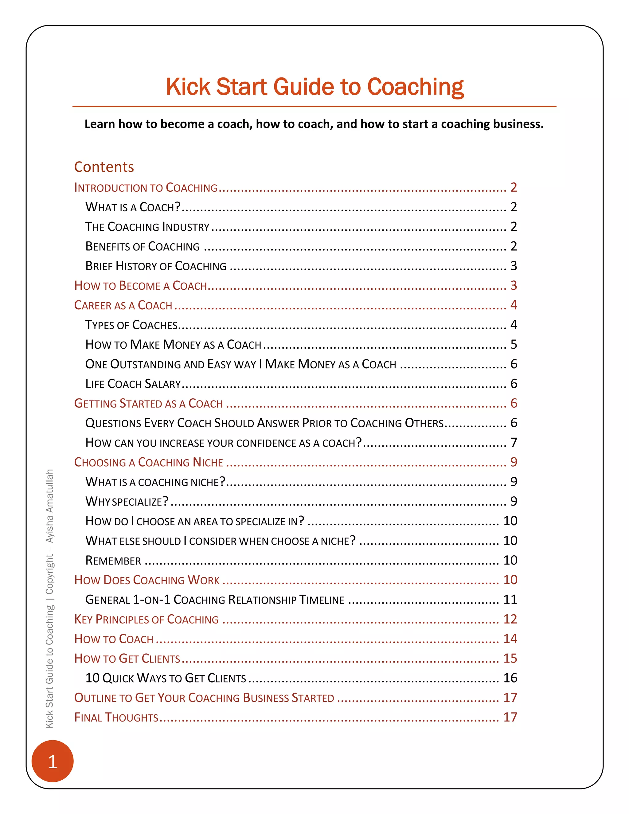 The document is a comprehensive guide on how to become a coach, detailing the coaching industry, its benefits, and essential skills needed for coaching. It covers topics such as types of coaching, how to attract clients, the importance of choosing a niche, and practical steps for starting a coaching business. Additionally, it emphasizes the significance of self-awareness, authenticity, and continuous learning for aspiring coaches.