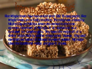 This document provides a recipe for zebra-striped rice krispie treats. It uses both regular rice krispies and cocoa krispies, along with white and milk chocolate chips, to create the two-toned stripes of a zebra pattern when pressed into a pan. The recipe calls for melting marshmallows and butter with each type of cereal and chocolate chips before pressing the two mixtures together in strips to resemble a zebra. The treats are then chilled or left to set before enjoying.