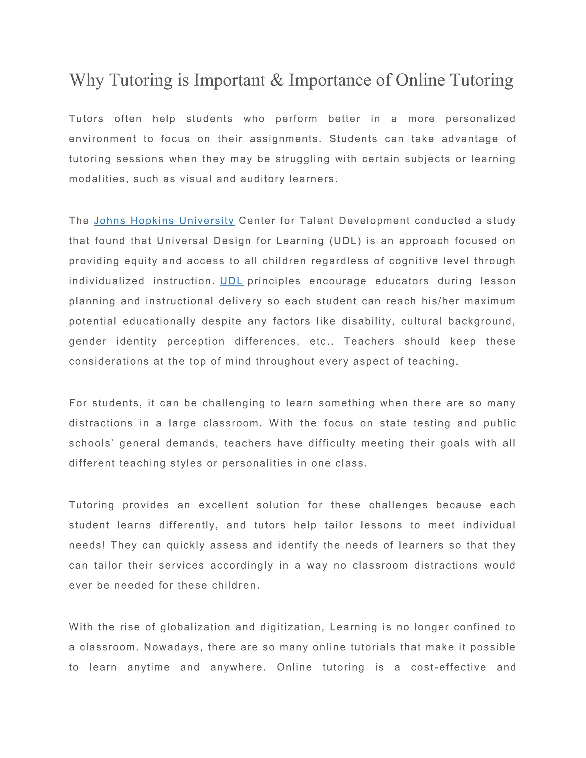 Tutoring provides personalized assistance for children struggling with schoolwork, helping them improve their skills and confidence with one-on-one attention. It addresses individual learning needs, accommodating various learning styles and distractions in traditional classrooms, ultimately enhancing students' academic performance and attitudes towards learning. Online tutoring offers a flexible and cost-effective solution for students, making educational support accessible regardless of their circumstances.