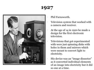 - Philo Farnsworth's early experiments with electronic television in the 1920s. Regular broadcasts began in the 1930s by the BBC.