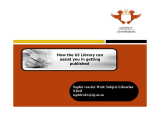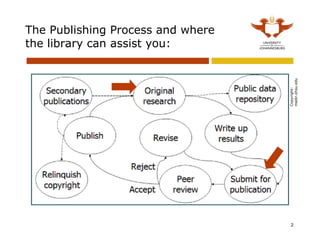 The document outlines how the university library can assist authors in the publishing process, including finding the right journal, obtaining author guidelines, and identifying editors. It emphasizes the importance of journal selection, following submission protocols, and provides resources for locating accredited journals and potential co-authors. Additionally, it includes tips on navigating databases, and ensures new authors understand etiquette regarding simultaneous submissions.