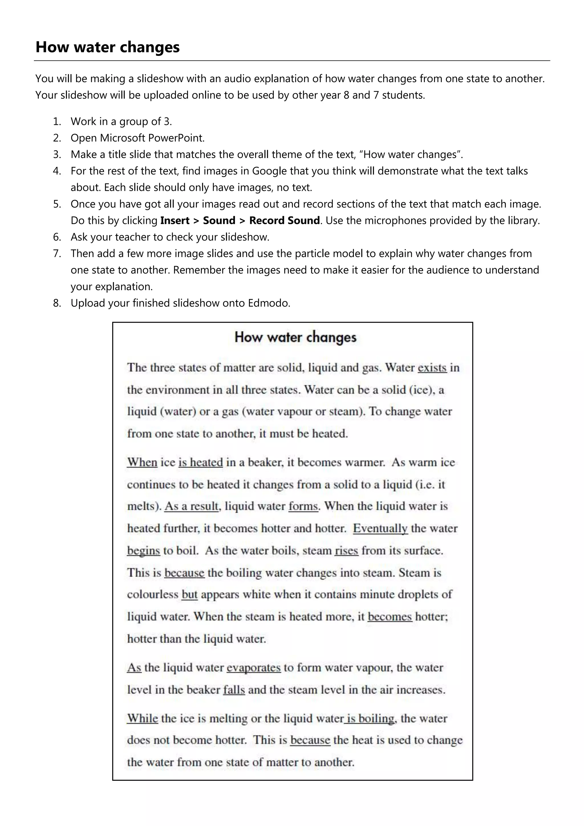 This document provides instructions for students to create a slideshow and audio explanation about how water changes states from solid to liquid to gas. Students will work in groups of 3 to make a PowerPoint with images from Google that demonstrate each state of water. They will record audio explanations for each slide using microphones from the library. The slideshow must include a title slide and additional slides using the particle model to explain water state changes, and it will be uploaded online for other students.