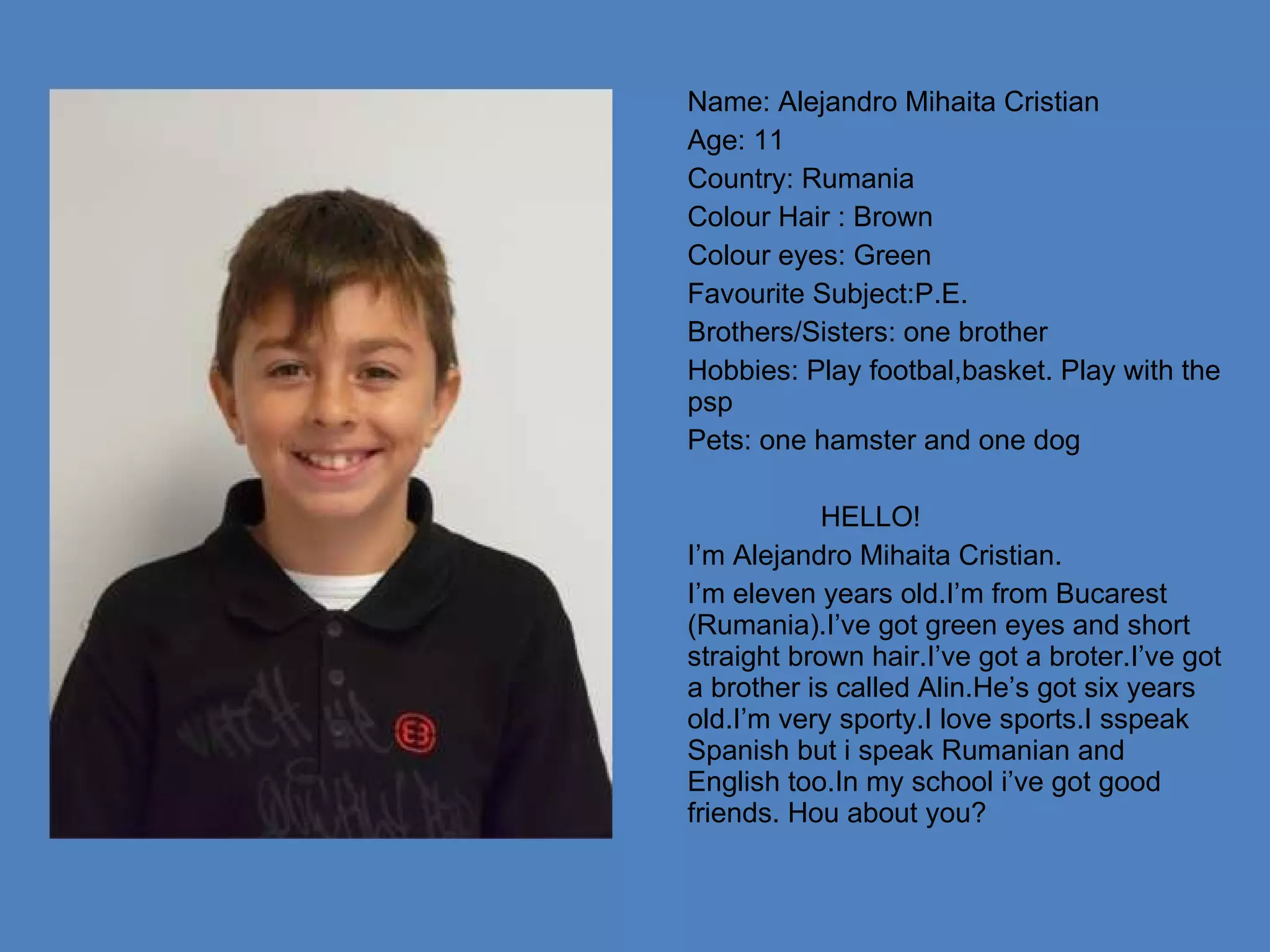 The document contains profiles of several students between ages 11-13 from Spain and Romania. Each profile includes their name, age, country of origin, hair color, eye color, favorite subject, siblings, hobbies, and a brief self introduction. They discuss living in Spain or Romania, their favorite activities such as sports or music, and languages they speak.