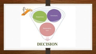 The document discusses how both rational thinking and emotions play important roles in decision making. While rationality can be limited and hoodwinked, emotions integrate feelings to help choose among options and provide an accurate shortcut based on experience. Even when we think we know nothing, our feelings are trying to convey what our flexible and empirical brain cells have assessed based on reality. Both logic and emotions are necessary, as reason without emotion is impotent and feelings let us understand information we can't directly comprehend.