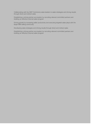 This document discusses strategies for sales growth, including collaborating with sales leaders to develop sales strategies and drive results through direct and indirect sales, establishing a strong partner ecosystem by recruiting partners and building an effective channel sales program, and driving growth by increasing seller productivity and executing targeted sales plays with a larger selling community.