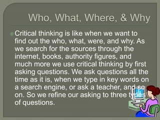 1) Critical thinking involves asking questions to gain knowledge on a subject from various sources like the internet, books, and experts. There are three main types of questions: factual, interpretive, and opinion.