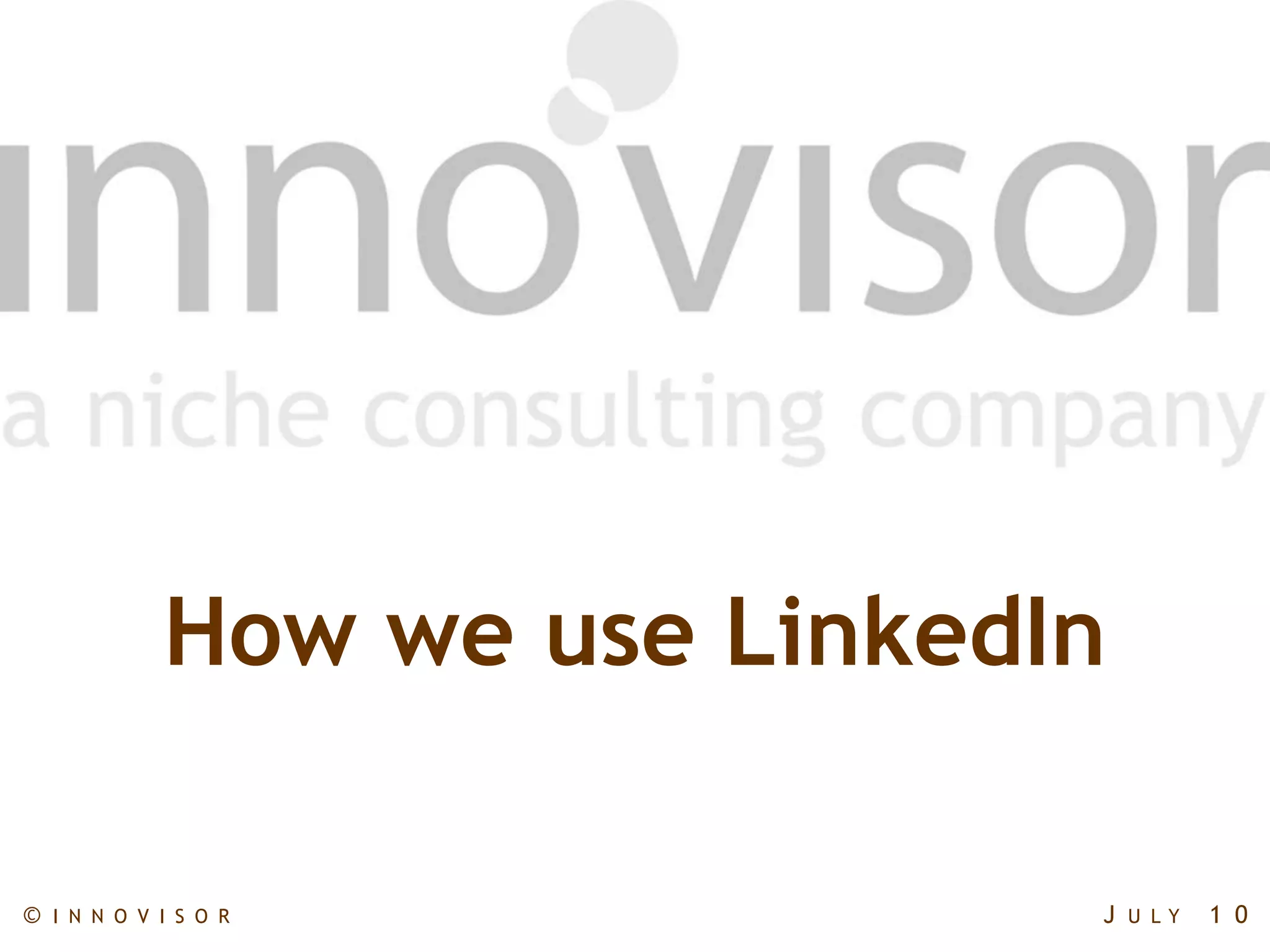 This document discusses how Innovisor analyzes and uses its LinkedIn connections. It generated data on its consultants' LinkedIn relations to identify potential customers within their shared network. It found the top 20 companies Innovisor has connections to, including NNIT, Novo Nordisk, and Capacent. A chart shows how these top companies are connected to each other through Innovisor relations. The document also identifies another 20 companies with 4+ connections that could be potential customers and aren't fully focused on yet. It encourages using LinkedIn as a platform for dialogue to understand shared connections and consider initiatives targeting the shared network.